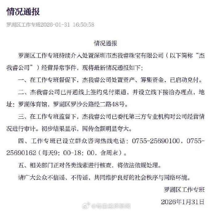 据报道,1月31日,深圳罗湖区工作专班发布情况通报称,杰我睿公司处置资产、筹集资金,已启动兑付,目前已经开通线上签约兑付渠道,并于罗湖体育馆设立线下接洽办理点。