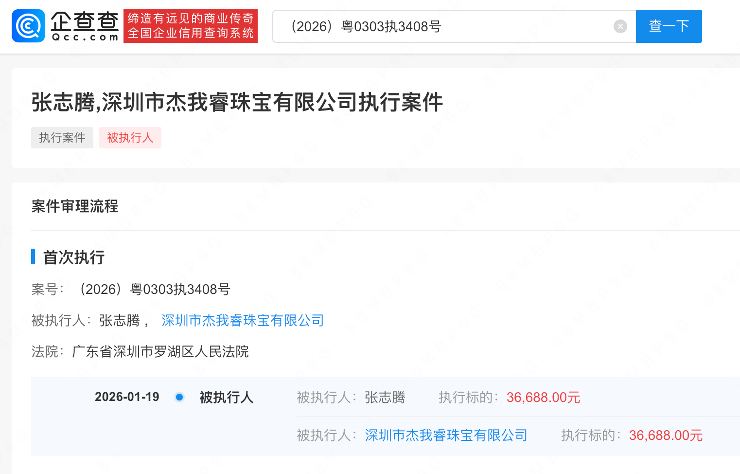 【#杰我睿及法人被强制执行3.6万#】2月3日,观察者网从企查查APP了解到,近日,深圳市杰我睿珠宝有限公司及其法定代表人张志腾被强制执行3.6万余元,执行法院为广东省深圳市罗湖区人民法院。