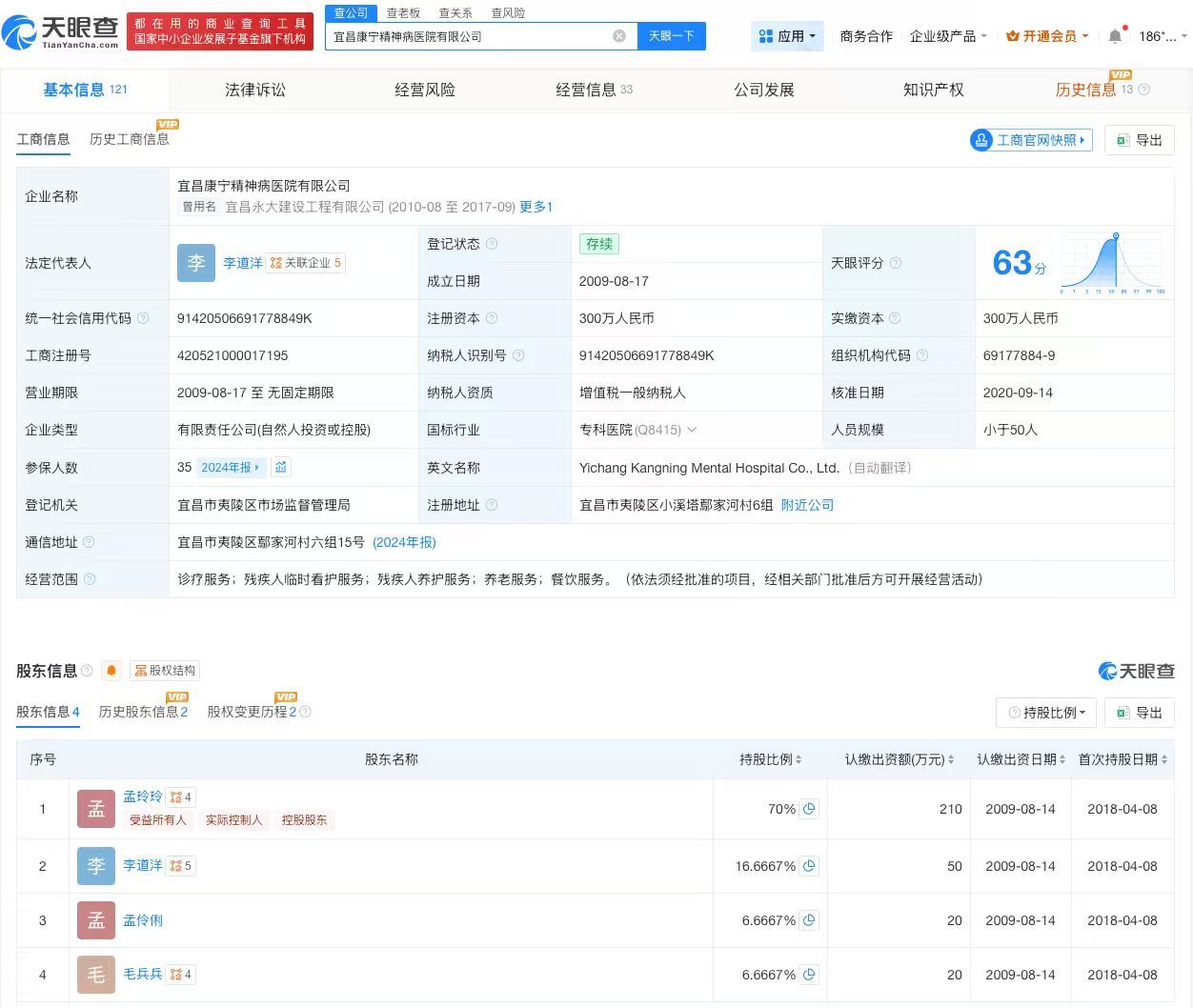 宜昌康宁精神病医院有限公司成立于2009年8月,法定代表人为李道洋,注册资本300万人民币,经营范围为诊疗服务、残疾人临时看护服务、残疾人养护服务、养老服务、餐饮服务。股东信息显示,该公司由孟玲玲、李道洋等共同持股。值得注意的是,此前该公司企业名称为宜昌永大建设工程有限公司。#记者卧底精神病医院许多病人无异常##精神病医院惩罚病人最久绑3天3夜#