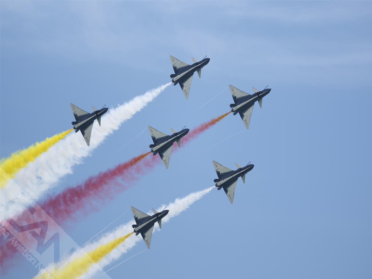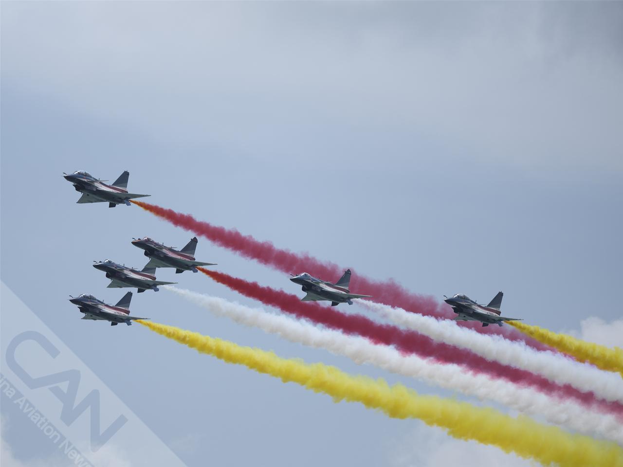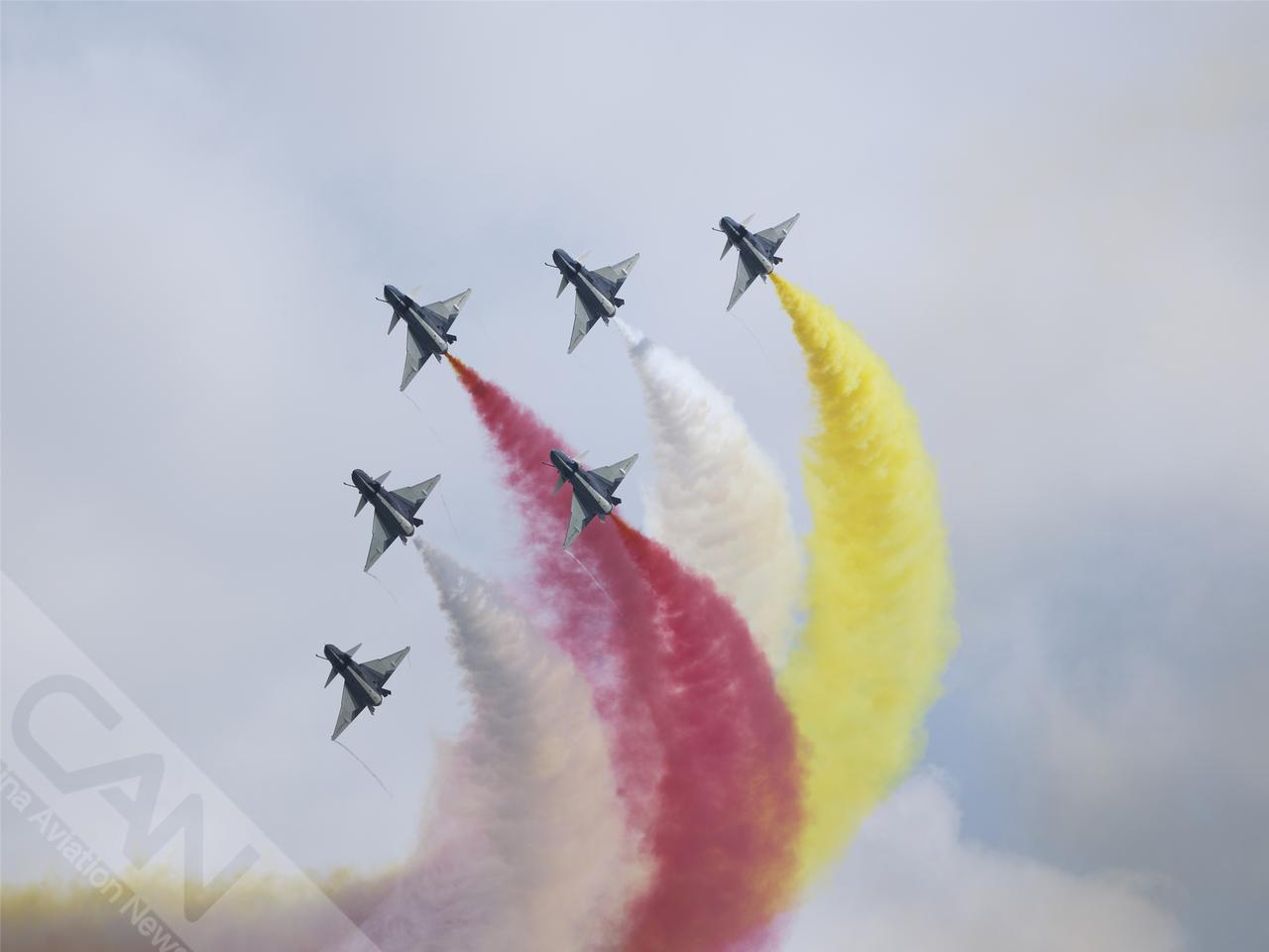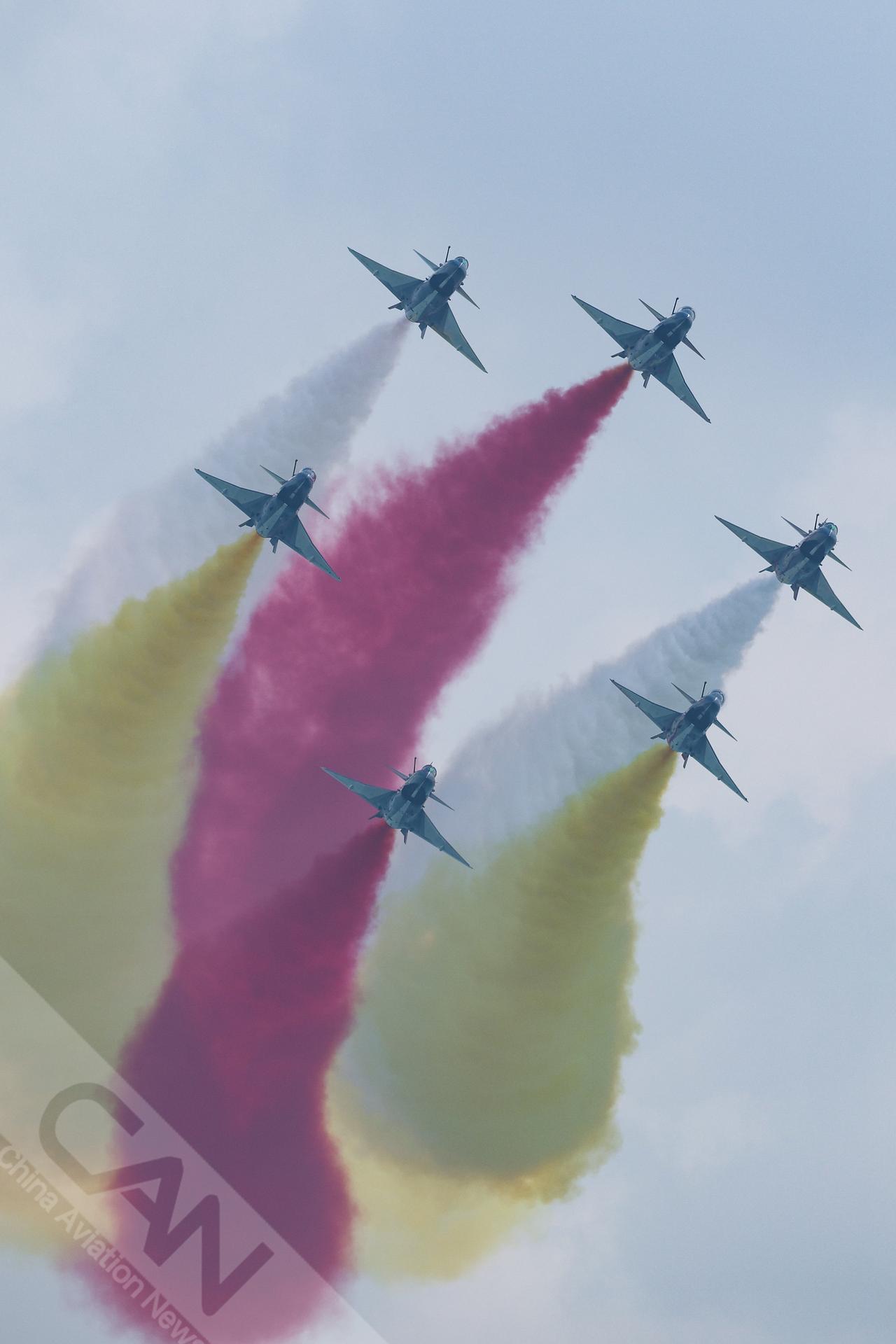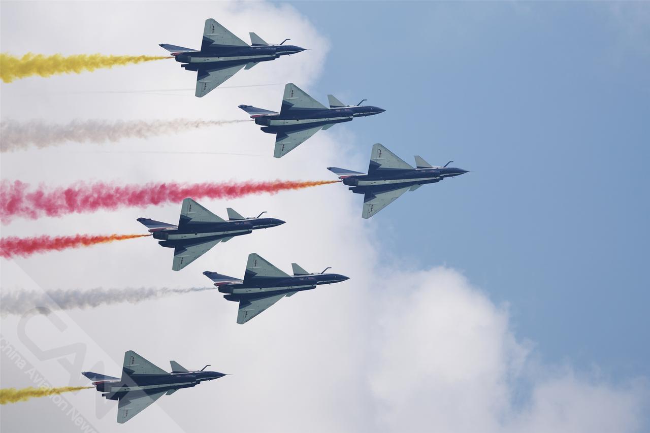 空军八一飞行表演队在樟宜机场上空展示,这是该表演队换装歼10C后首次在新加坡亮相,也是时隔6年再次应邀参展。(摄影:卢洪 王强 潘力)