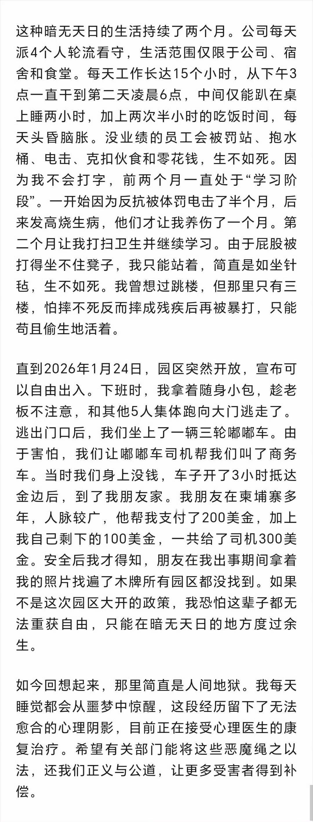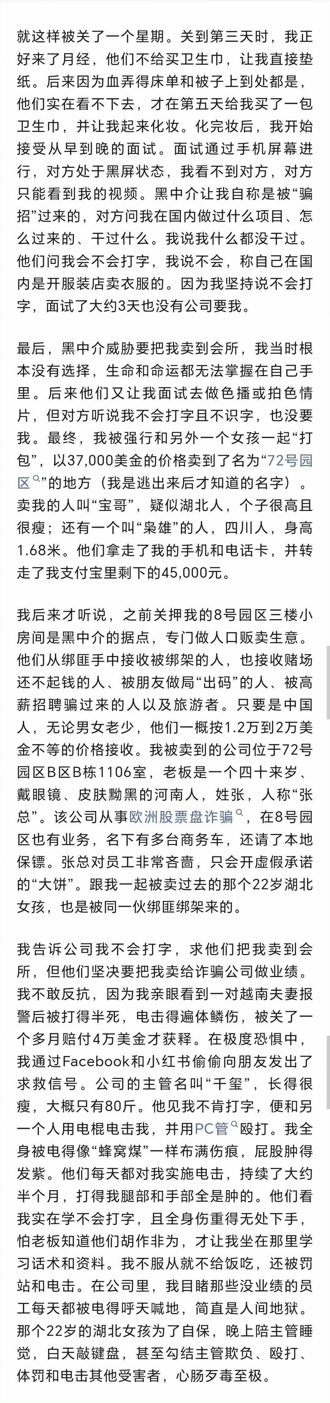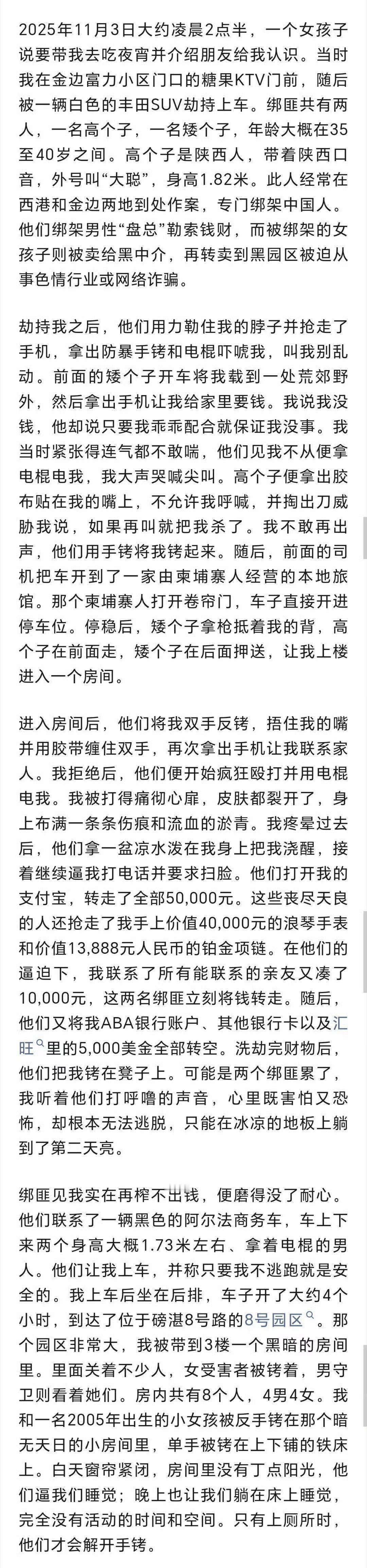 一名女子向西港日记讲述自己在柬埔寨遭遇绑架转卖折磨惨痛经历 女子之前在深圳华强北开服装店后来倒闭。不久,她前往柬埔寨。2020年与朋友在柬埔寨金边金街开了一个叫“悠然按摩”的按摩店,到了2022年年末,柬埔寨疫情严重,按摩店倒闭。2023年中,她南下西港在KTV工作,后来谈了一个福建男朋友,自此不再工作,靠男朋友生活,一直到2025年11月初,她开始真正遭遇噩梦... ...