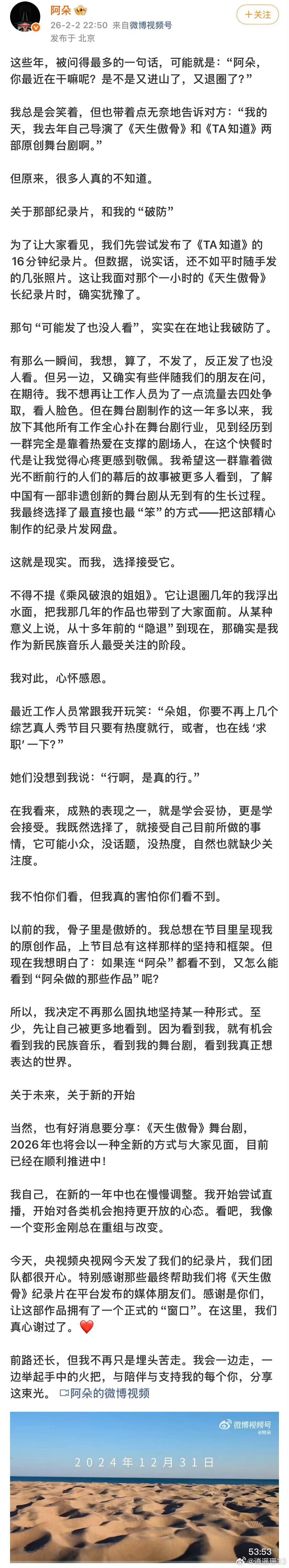 阿朵回应退圈传闻 看完感慨,艺人专注作品却少人关注挺无奈的。阿朵说如果大家看不到她,也就看不到作品。那就期待她未来多多露面,带来更多好作品吧。