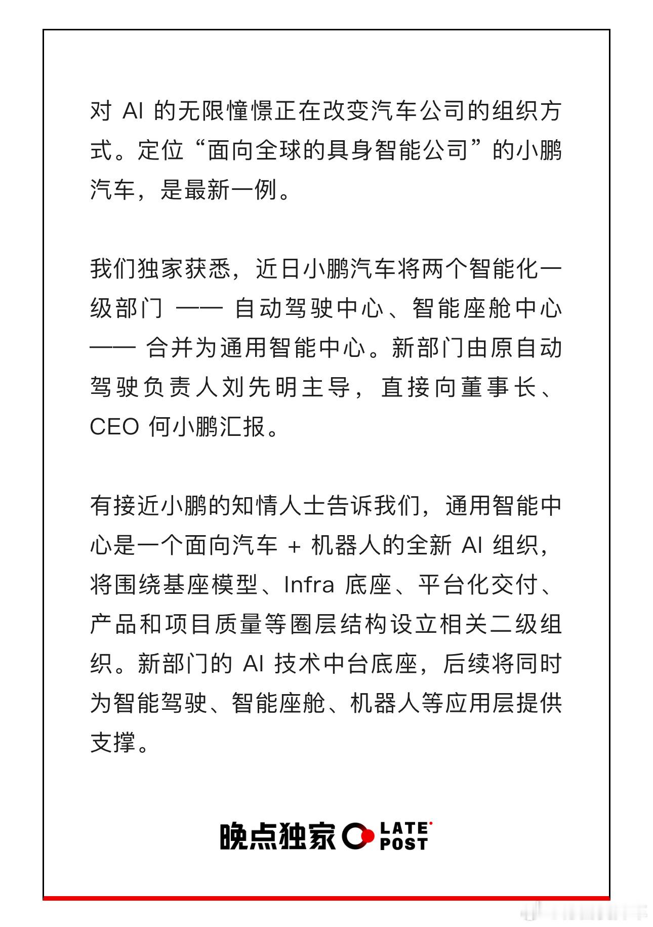 新部门由原自动驾驶负责人刘先明主导,直接向董事长、CEO 何小鹏汇报。