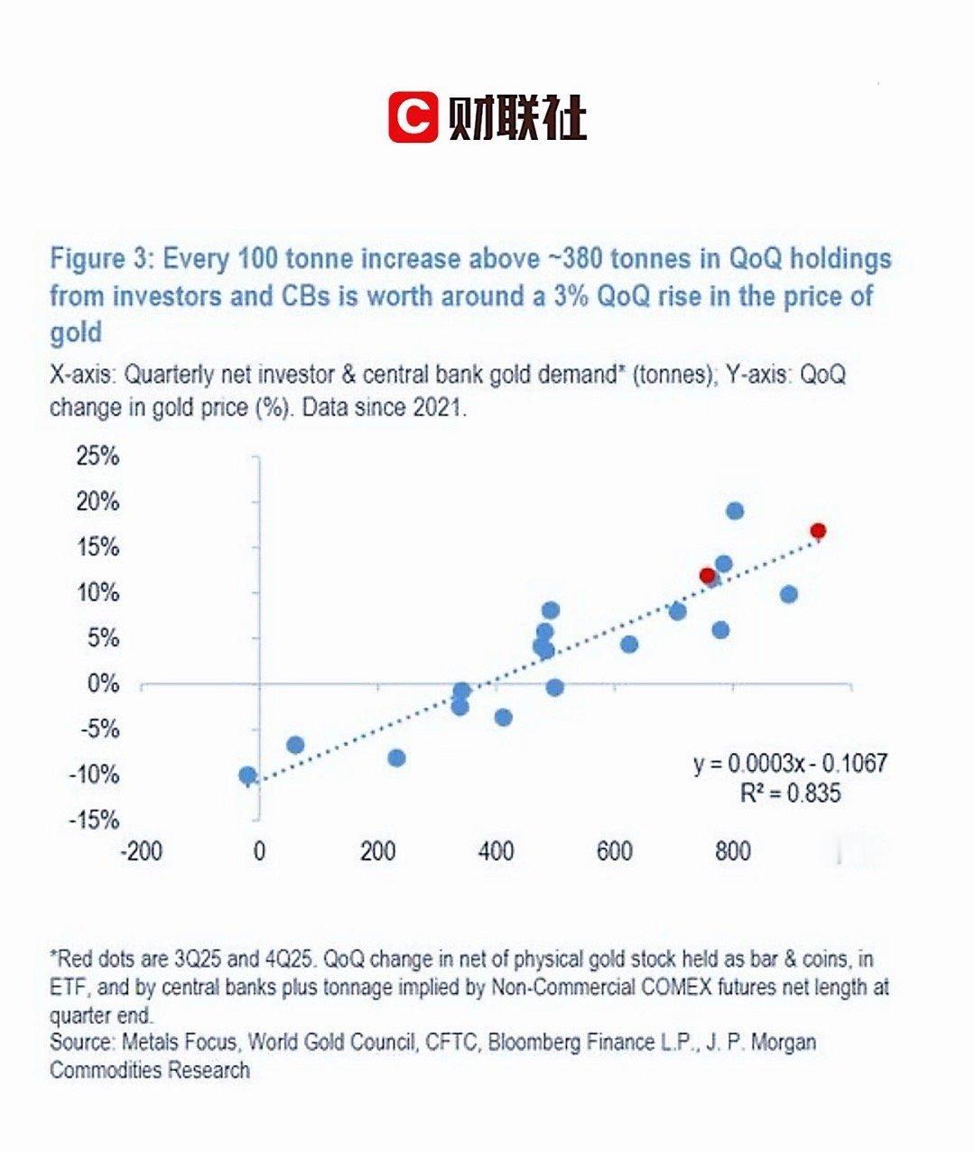 财联社2月3日讯 财联社周一曾报道过,在经历了上周五黄金价格史诗级暴跌后,摩根大通目前仍然坚持看多立场,将2026年底的黄金价格预测从此前的5400美元上调至每盎司6300美元,理由是来自各国央行和投资者的需求持续且不断增强。