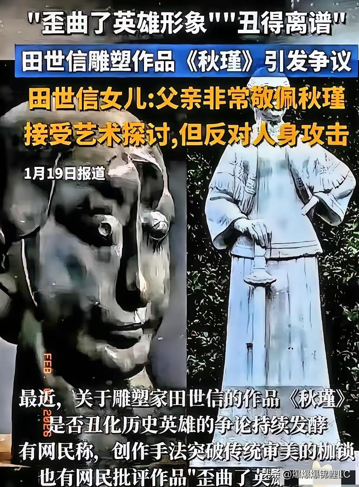 秋瑾后人这次是真的动真格了!那个把女侠捏成“歪嘴斜眼”的雕塑家田世信,这回怕是睡不踏实了。 家里人之前还硬说是为了表现“破茧成蝶”,嫌咱们老百姓不懂艺术。结果呢? 网友照着这个“艺术风格”给田大师捏了个像,他家里人立马急眼,嚷嚷着要维权。 合着你们糟践英烈就是“写意”,别人模仿一下就是“侵权”?这双标玩得简直太溜了。 现在材料都递上去了,法律可不管你什么艺术流派。 这根本不是审美的差距,是做人的差距。这下咱们就等着看,这一家子的“艺术傲慢”在法庭上还能不能站得住脚。