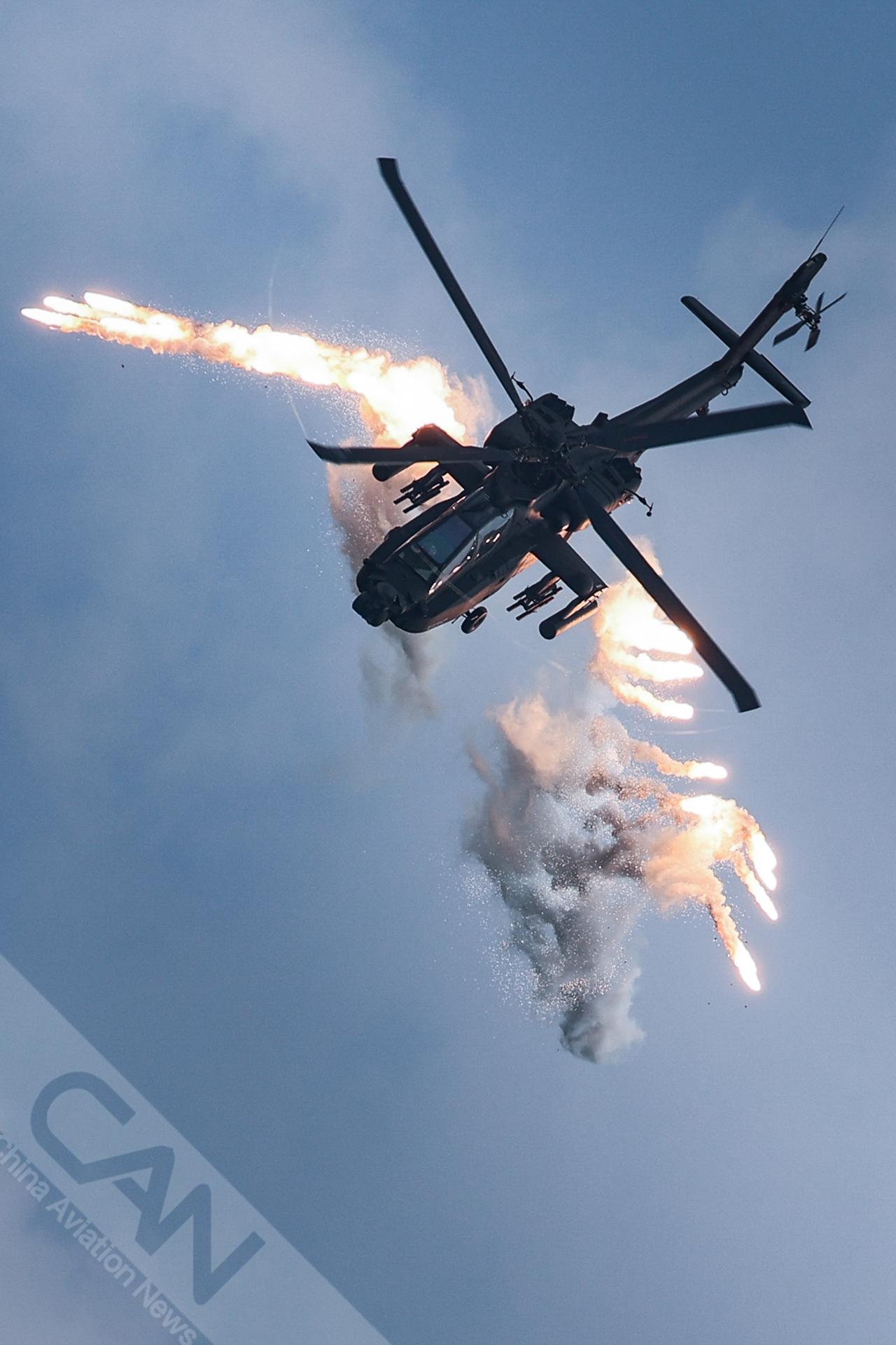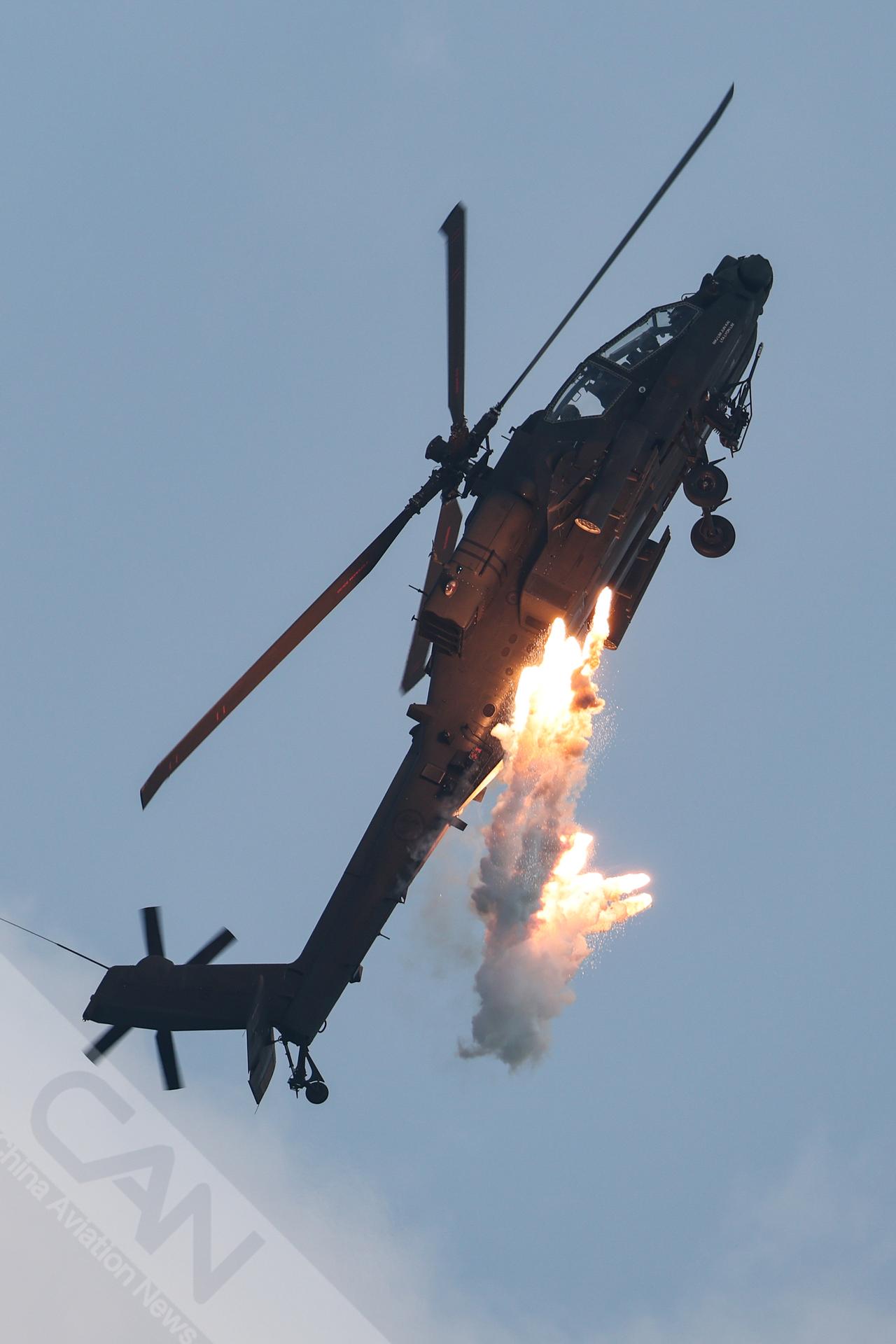 2月1日,新加坡航展举行媒体预演,新加坡空军阿帕奇AH-64D直升机释放干扰弹,一起欣赏“天女散花”。(摄影:王强 潘力)