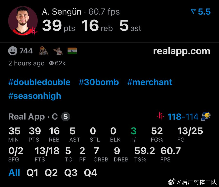 火箭118-114战胜步行者取得三连胜,申京39分16篮板5助攻,阿门16分11篮板7助攻,杜兰特未出场。西亚卡姆27分,马瑟林25分。