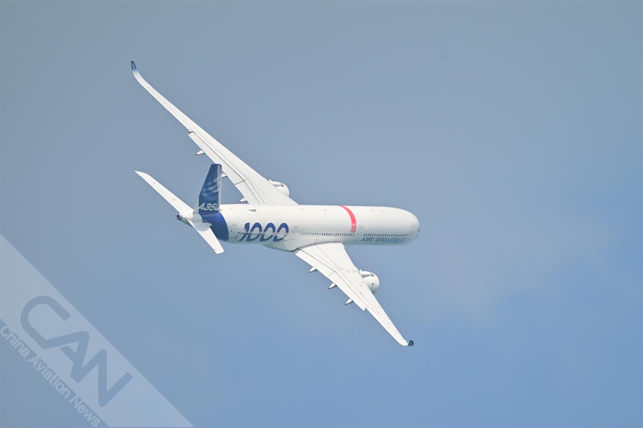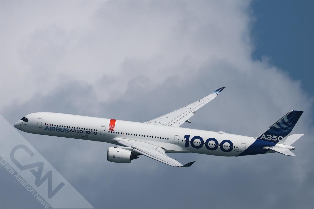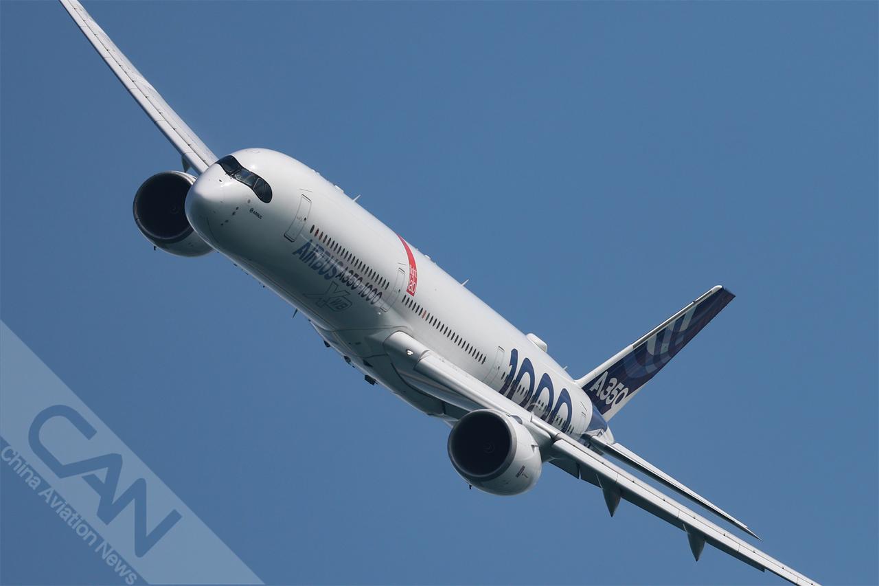 2月1日,一架空客A350-1000客机在新加坡航展媒体预展上进行飞行表演。(摄影:杨涛瑞 王强 潘力)