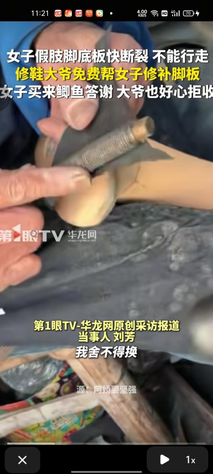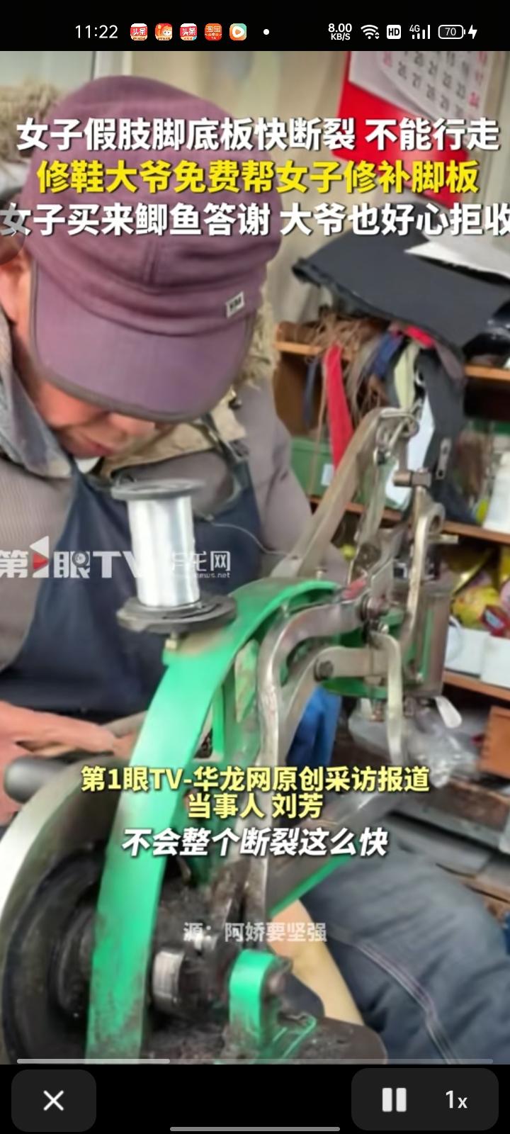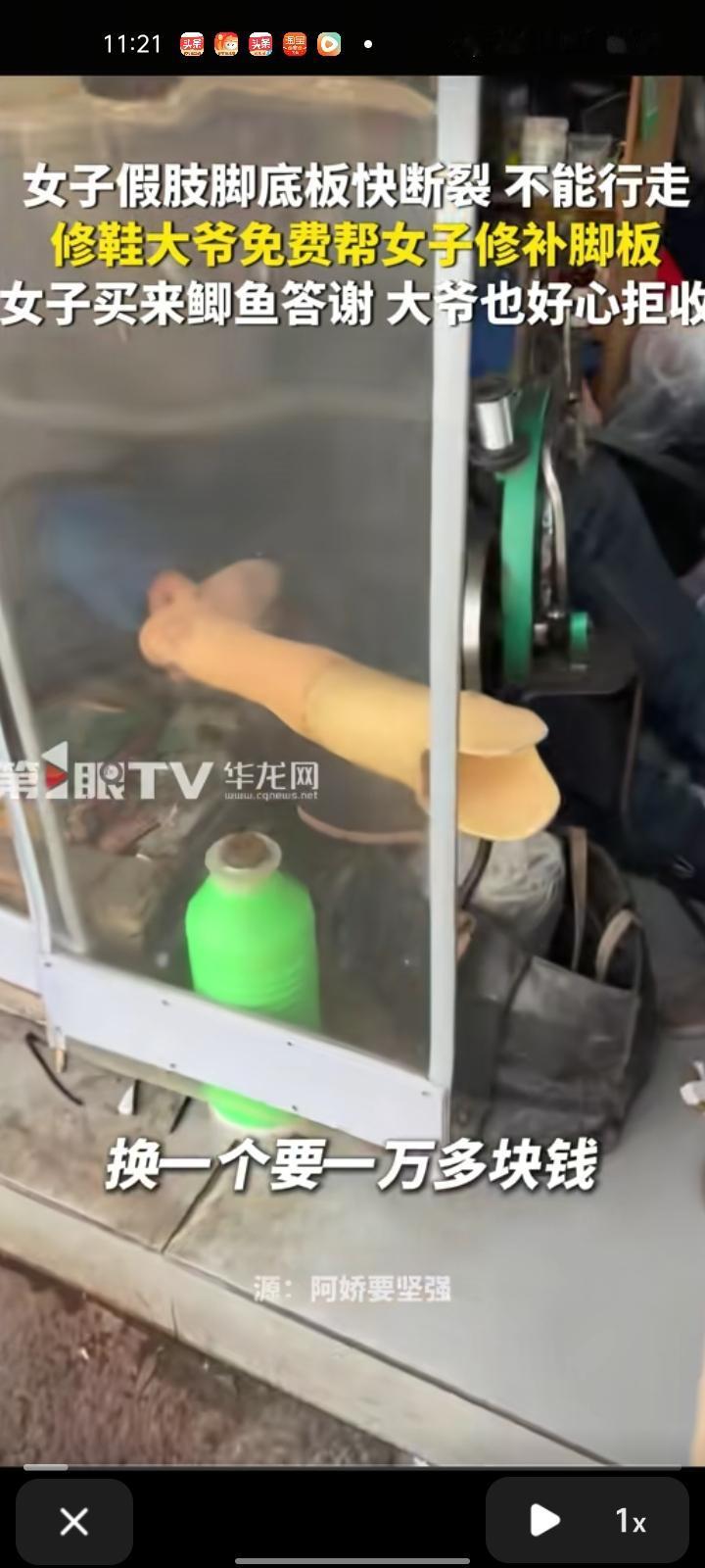 1月30日,江苏无锡。刘女士戴着假肢走路时,假肢脚底板块断裂,换一个要一万块钱。自己舍不得换,就去修鞋店让大爷贴一张皮,大爷看到她脱下假肢那一刻满是震惊,就给她免单。 事后,刘女士在菜市场买点菜,买一条鲫鱼送给修鞋大爷,大爷也好心拒收。她表示,大爷很不容易,那么大年纪了,我接受大爷的善意,我也想用自己的善意去回报他,但大爷只说了一句“谢谢”,虽然大爷没收下鲫鱼,单大爷心里一定会很开心。