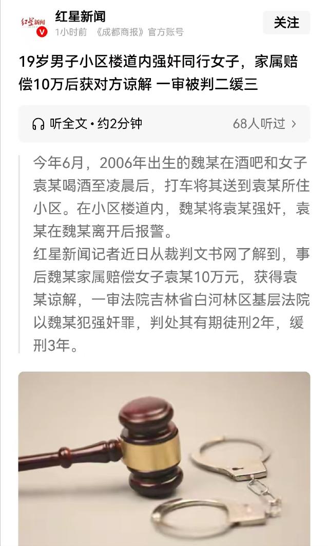 吉林白河,19岁小伙深夜与一女子在酒吧喝完酒后,送对方回家,走到对方小区一楼楼道内见四下无人起了邪念,将对方双手按在墙上,不顾对方的反抗,先后两次从背后侵入对方的身体,而后离开现场。事后,对方报警,虽然小伙赔偿了对方10万元,取得了对方的谅解,但仍被判处有期徒刑2年,缓刑3年! 这天是六月初,晚上九点,魏某和两位女同事一同相约去酒吧聚会,小半夜里白河的夜风还有点凉,酒吧里却是另一番光景,灯光刺眼,音乐震天响。 三人从坐下聊天开始气氛就挺热络,喝了不少酒。 凌晨接近三点,袁某已经醉得有点晃悠不稳,魏某看她走不了,主动叫了出租车。 车到了小区门口,尤某没有下车,魏某说他来送袁某上楼,尤某也没多想就走了。 小区楼道没人,周围安静,声控灯也坏了,整个空间只有脚步声踩在楼板上的回响。 魏某扶着袁某往楼上走,到了一楼里头的一个角落,忽然动作变了。 他把袁某按在墙上,动作粗暴,袁某虽然醉,但意识还在,很快明白魏某意图,开始哭,也拼命反抗。 身体左右来回摇晃,想挣脱,但怎么都挣不开。 魏某力气大,情绪也激动,没管袁某说些什么,继续把持局面,先后对袁某做出侵害行为,两次之后才松手。 袁某瘫坐在墙角,不停哭,情绪几乎要崩溃。 魏某走了,离开得很快,也没试图掩盖什么。 袁某强忍着情绪拨打了报警电话,警察到场后在墙面和地上发现了一些现场痕迹。 监控也被调取出来,画面显示魏某并未如他后来所说那样醉得不省人事,反而动作从容,神志清醒。 接到警方通知后,魏某到了派出所,穿着校服,低头、不说话,看上去后悔,但事情已经造成,这时候说什么都晚了。 法医、录像、证人、现场记录,线索很快锁定指向魏某,检方以强奸罪正式对他提起公诉。 魏某面对质证时承认了自己行为,表示认罪、悔过。 他是第一次犯法,家属也开始四处奔走,为了争取从轻处理,魏某母亲求到了人民调解委员会。 家里条件不好,两位老人是普通工人,要在短时间内凑出十万元,不是件容易的事。 父亲接连干两份工,母亲去借钱,最后凑出了赔偿金。 通过调解机构,把钱交到了袁某手中。 袁某也并不是轻易就同意,她曾三天未出门,思忖再三才签下谅解书。 对于她来说,这笔赔偿金确实能解决眼下很多现实困难。 但那个夜晚的场景,昏暗楼道的恐惧,一直无法从脑中抹除。 法院开庭那天,魏某全程低头,几乎不说话。 检方证据完整,案件事实清楚,魏某认罪态度也符合司法认定范围。 法院判决最终落定,判处魏某有期徒刑两年,缓刑三年。 这意味着他不会立刻服刑,但必须在考验期内遵守法律规定,不得再犯。 一旦违反,将立刻执行原判。 不久,小区坏掉的声控灯被换成了更亮的那种,社区也张贴了新的提示海报。 提醒居民在夜晚出行提高警惕,更提醒人们,隐秘的角落最容易滋生无法挽回的错误行为。 整个案件给人留下的不是过程的曲折,而是一个简单直接的警醒。 世上没有如果,当冲动超过理智,代价就不止是金钱那么简单。 主要信源:(澎湃新闻——奇葩!男子“好心”送醉酒女子回家,结局令人愤怒!)。