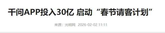 一个明显的信号!今年春节将会出现一个重大变化,很可能复制10年前的盛况。千问APP宣布投入30亿启动春节攻势,以免单形式请全国人民在春节期间吃喝玩乐。 谁能料到,沉寂多年的春节互联网大战,今年居然要卷土重来!阿里旗下的千问APP,2月2日突然官宣,直接砸出30亿启动春节请客计划,以免单的方式,请全国人在春节期间吃喝玩乐,这架势,分明是要复刻10年前互联网大厂扎堆撒钱的热闹场面。 说起早些时候春节,估计不少人还有印象,不管是年轻人还是长辈,茶余饭后聊的,都是哪家APP红包多、哪家福利实在,那时候没有太多复杂的玩法,不用拉人头、不用攒积分,大厂们就是实打实撒钱。 微信红包刚兴起,支付宝集五福火遍全网,还有各种购物补贴、话费减免,普通人过年走亲戚,手里刷着手机领福利,那种热闹劲儿,之后好几年都没再出现过。 本以为那种全民薅福利的盛况,只会停留在回忆里,没想到千问APP一出手就是30亿,直接把春节的氛围感拉满,而且人家说了,这30亿不搞虚的,不发小额红包,不搞复杂任务,全程免单形式,覆盖咱们春节吃喝玩乐的方方面面。 可能有人会问,这30亿免单到底怎么领?是不是又要套路大家?其实真不用操心,千问APP的活动特别实在,2月6日正式上线后,只要更新到最新版本,不用拉好友、不用签到,正常消费就能享受免单或折扣。 这笔30亿的补贴,可不是单独发力,而是联动了阿里全家桶。不管是在盒马买年货、天猫超市囤零食,还是飞猪上订机票酒店、大麦网买电影票,甚至是点外卖、喝奶茶,用千问APP下单,都有可能触发随机免单,运气好能直接免全额。 腾讯旗下的元宝 APP 在 2 月 1 日 0 点就宣布拿出 10 亿现金红包,主打无门槛提现,引发全网狂欢;2 月 2 日,千问 APP 这一官宣春节的福利大战,彻底拉开了序幕。 两者的福利玩法差别挺大,千问是消费免单,主打刚需省钱,适合过年要办年货、要出行的人,不用特意花时间搞活动,正常消费就能薅羊毛。元宝则是纯现金红包,能直接提现到微信,就是需要分享好友增加抽奖次数,适合爱刷手机的年轻人。 大家可能没注意,千问砸30亿搞春节活动,不只是为了请大家吃喝玩乐,背后藏着的,是互联网大厂对AI市场的争夺。 今年春节,各大厂商都铆足了劲,想借着春节的流量,抢占AI用户入口,千问这波30亿的投入,也是阿里春节活动史上的最高纪录。 千问APP本身是阿里的AI产品,这次联动全生态搞免单,就是想让大家在消费的时候,感受到AI的实用性,比如用千问AI查年货攻略、比价、下单,一边办事一边省钱,慢慢养成用AI的习惯,把AI从单纯的聊天工具,变成日常能用的生活助手。 而且这里要提醒大家一句,不管是千问的免单,还是元宝的现金红包,都得守规矩。 2025年底国家出台了相关规则,要求互联网平台的补贴不能虚假宣传,必须说清楚福利规则、参与条件,千问和元宝目前都公示了详细规则,大家参与的时候可以多留意。 不用怕被套路,要是遇到虚假补贴、提现门槛不合理的情况,还能向监管部门投诉维权。不过大家参与的时候也别贪心,元宝的红包大多是小额的,不用为了多抽奖过度分享,避免泄露个人信息,千问的免单仅限官方合作场景,消费前可以先看清楚规则。 其实对咱们普通人来说,大厂之间的竞争,反而是我们的福利。不管他们背后的目的是什么,最终受益的还是咱们老百姓,过年能多省点钱、多拿点实惠,比啥都强,这种复刻10年前的热闹场面,也让春节多了一份不一样的乐趣。 10年前的互联网大战,让我们感受到了科技带来的便利;10年后的今天,大厂们带着AI技术卷土重来,不仅给我们带来了福利,也让我们看到了AI时代的新变化。 这不仅仅是一场福利大战,更是科技进步的一种体现,让AI真正走进了千家万户。 这场春节福利大战,只是AI普及的一个开始,未来,会有更多实用的AI功能走进我们的生活,给我们的日常带来更多便利,而我们趁着这场大战,根据自己的需求薅一波实在的福利,开开心心过个年,就是最划算的选择。 不管是千问的30亿免单,还是其他厂商的福利活动,本质上都是科技企业回馈用户的一种方式,随着科技的不断发展,相信以后我们的生活,会越来越便捷,过年的福利也会越来越多,这也是时代进步给我们每个人带来的红利。 大家对此有什么看法呢?欢迎各位在评论区留言!