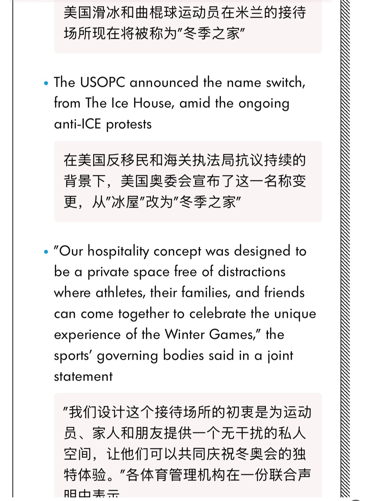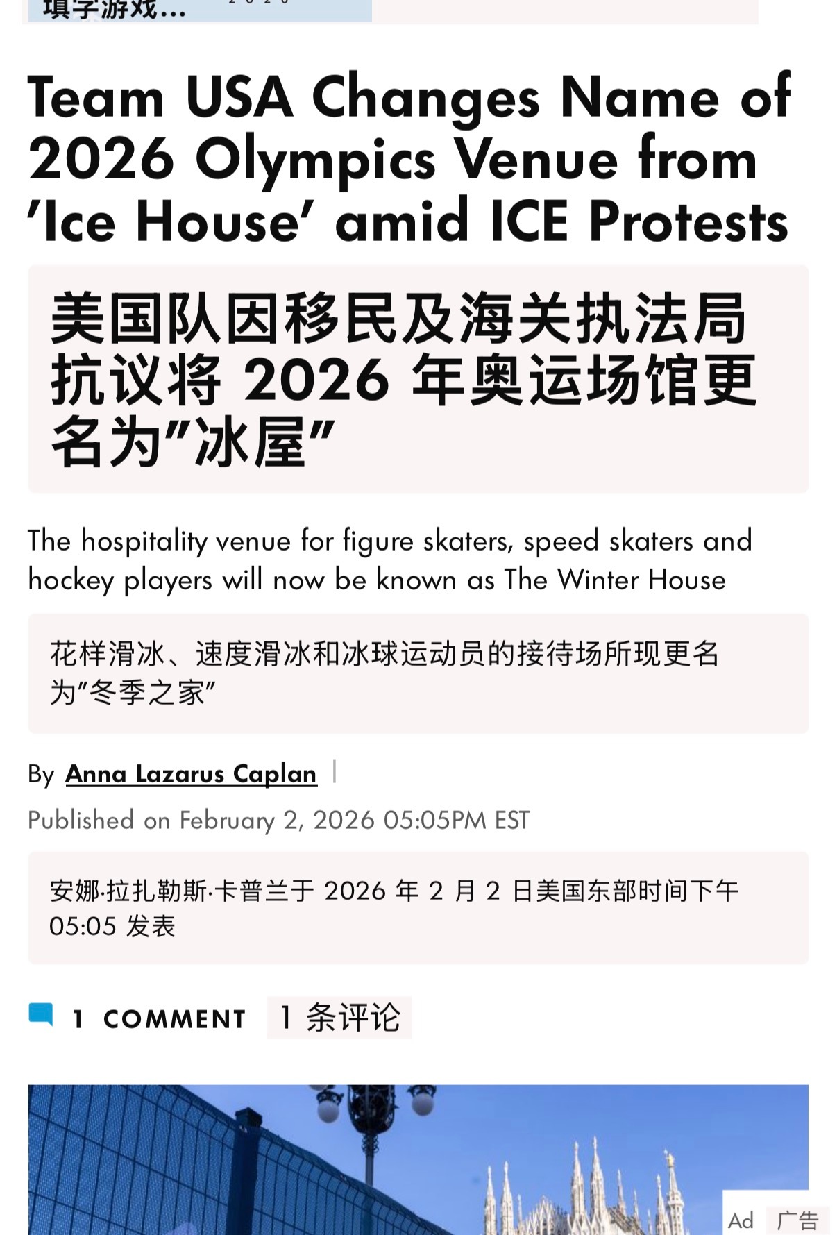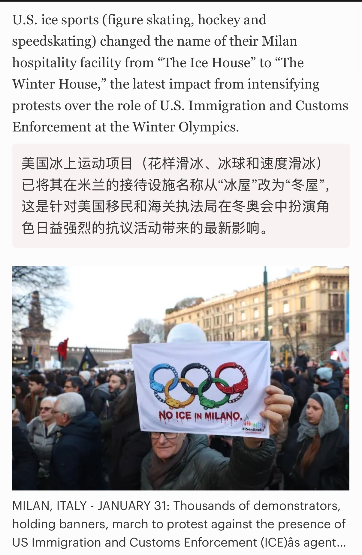 🔻乐。🔻美国花样滑冰协会(U.S. Figure Skating)、美国冰球协会(USA Hockey)和美国速滑协会(US Speedskating)联合决定,将他们为米兰冬奥会准备的运动员/团队招待场所(hospitality venue),从“The Ice House”改名为“The Winter House”。🔻这个变化发生在奥运会开幕前几天(米兰冬奥会于2026年2月6日开幕),属于“紧急”调整。 🔻主办方担心“Ice House”这个名字会被联想/双关到美国移民局ICE,引发负面关注、干扰或抗议 。🔻弥补了现代人没有见过避讳的遗憾。🔻via 福布斯、people热点现场海外新鲜事全民聊冬奥