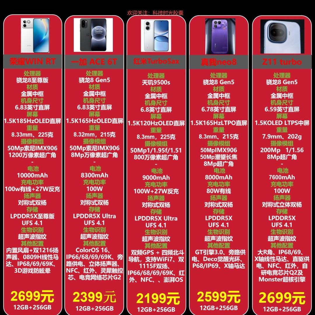 2026中端机五强混战!谁才是2K档真香机? 2026中端机卷成修罗场,五款旗舰下放机型各有狠活!纠结选机、怕买错踩坑的痛谁懂?直接干货对比: 红米Turbo 5 Max:9000mAh电池+天玑9500s,国补后1869元起,续航党狂喜,追剧游戏不用插电。 真我Neo8:三星165Hz护眼屏+3.5倍潜望长焦,影像+屏幕双优,拍照党闭眼冲。 一加Ace 6T:8300mAh+IP69K防水,2399元起(国补后2199元),户外党/重度用户稳了。 荣耀Win RT:骁龙8至尊+散热风扇+10000mAh,性能续航双天花板,游戏党专属。 iQOO Z11 Turbo:电竞芯片Q2+低延迟网络,2699元,手游大神必备。 价格1869-2699元全覆盖,配置官网+权威实测双实锤。 你是追续航、冲性能还是盯影像?评论区说需求,帮你精准排雷!