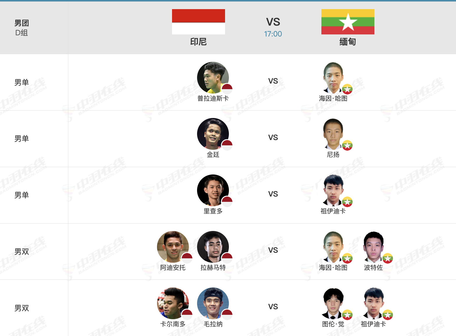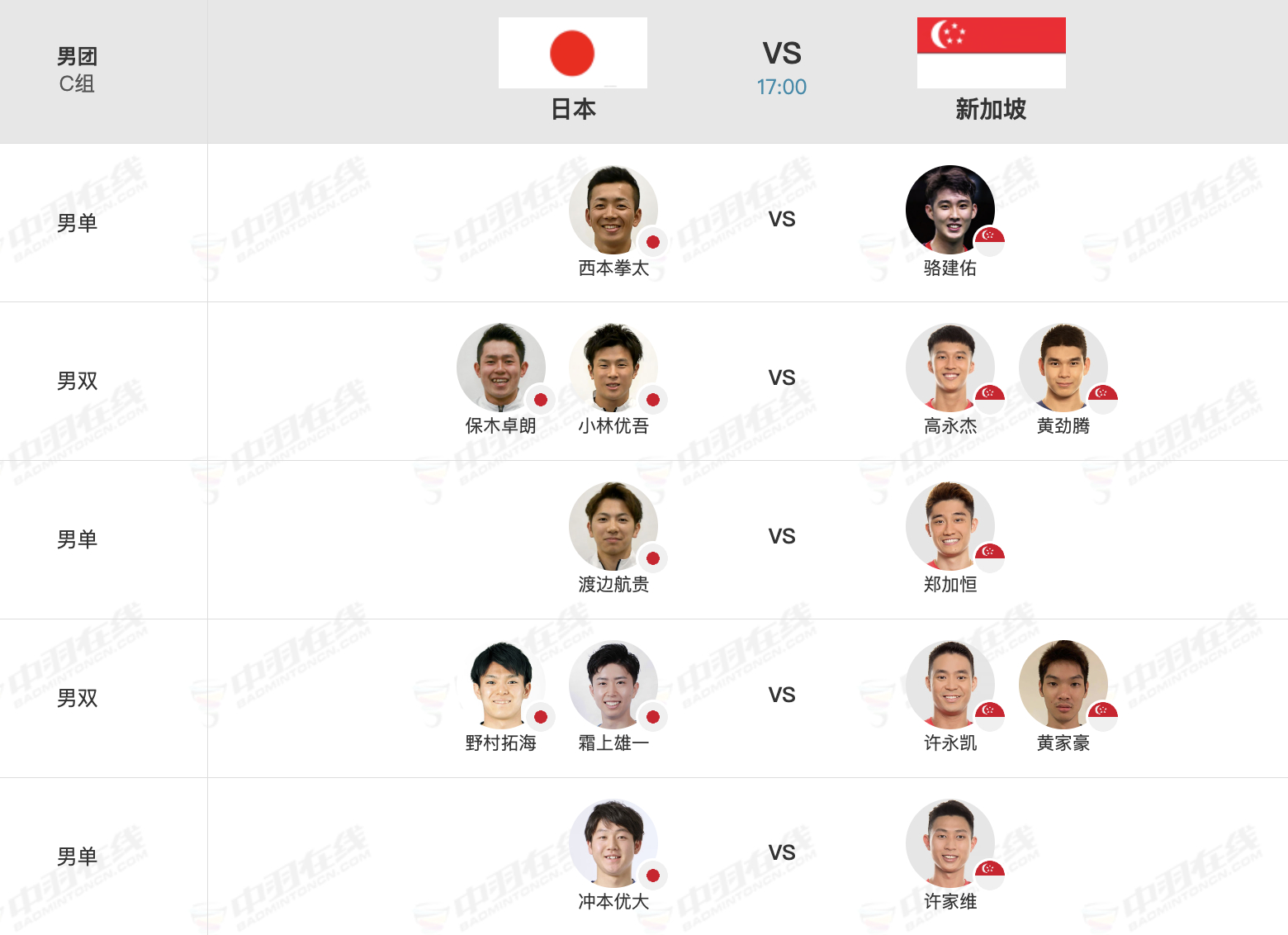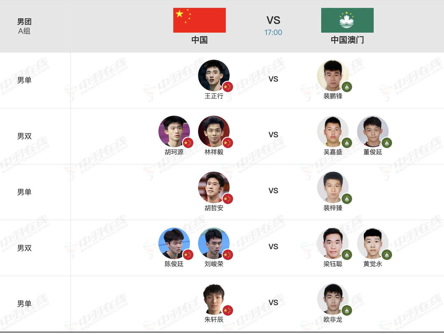 2026亚洲羽毛球团体锦标赛 2月3日17点对阵名单: 【1号场地男团A组:中国🇨🇳 vs 🇲🇴中国澳门】1、王正行🇨🇳 vs 🇲🇴裴鹏锋2、胡珂源/林祥毅🇨🇳 vs 🇲🇴吴嘉盛/董俊延3、胡哲安🇨🇳 vs 🇲🇴裴梓臻4、陈俊廷/刘峻荣🇨🇳 vs 🇲🇴梁钰聪/黄觉永5、朱轩辰🇨🇳 vs 🇲🇴欧非龙