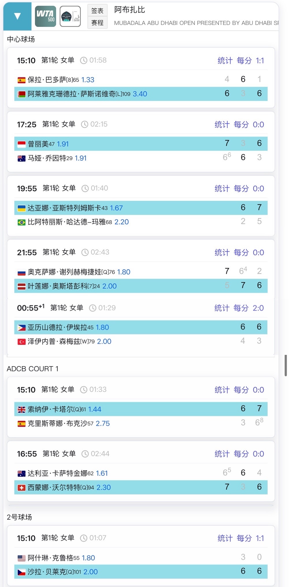 WTA阿布扎比第一比赛日赛果巴多萨爆冷出局奥斯塔彭科、伊埃拉晋级成功
