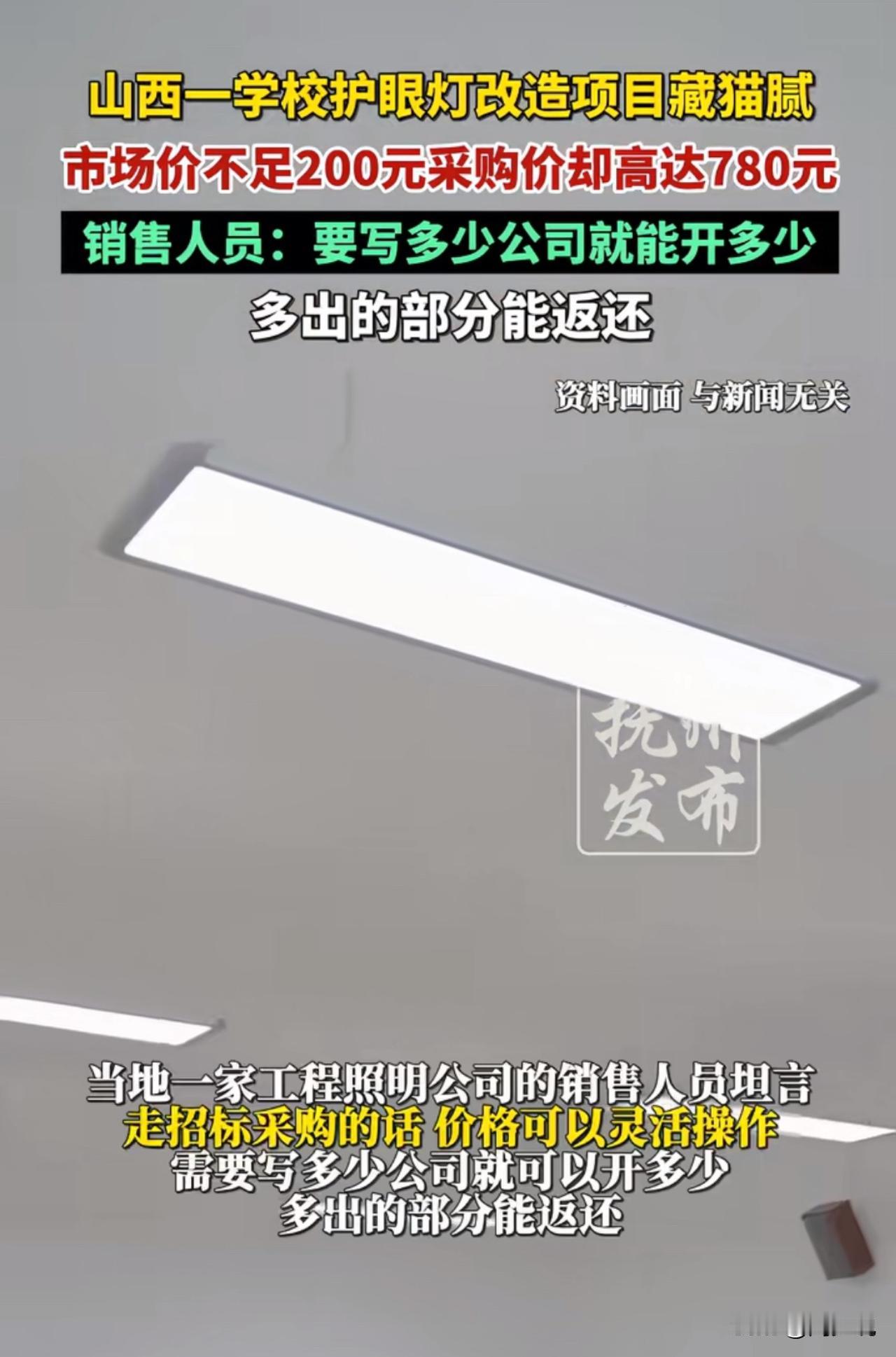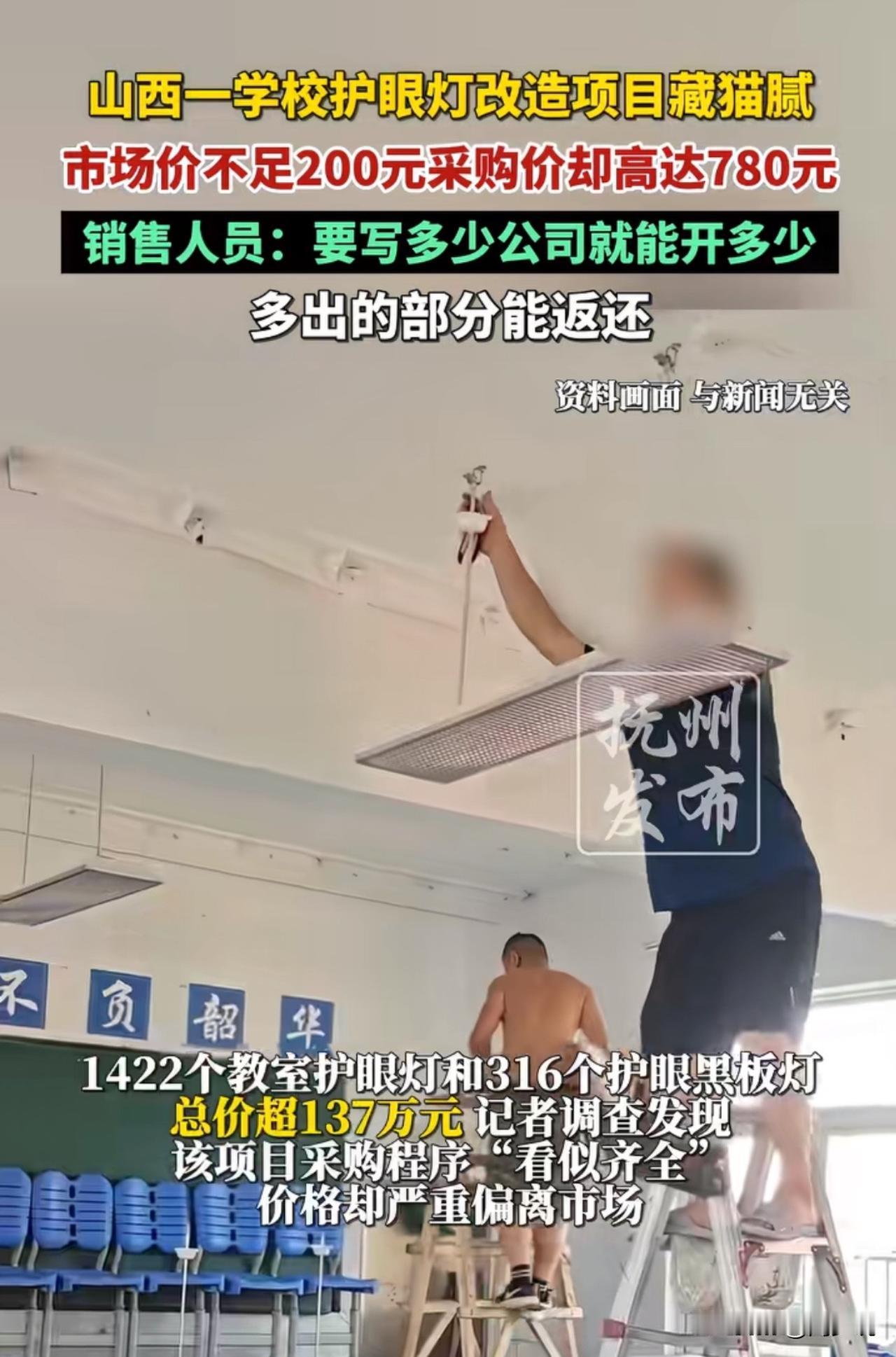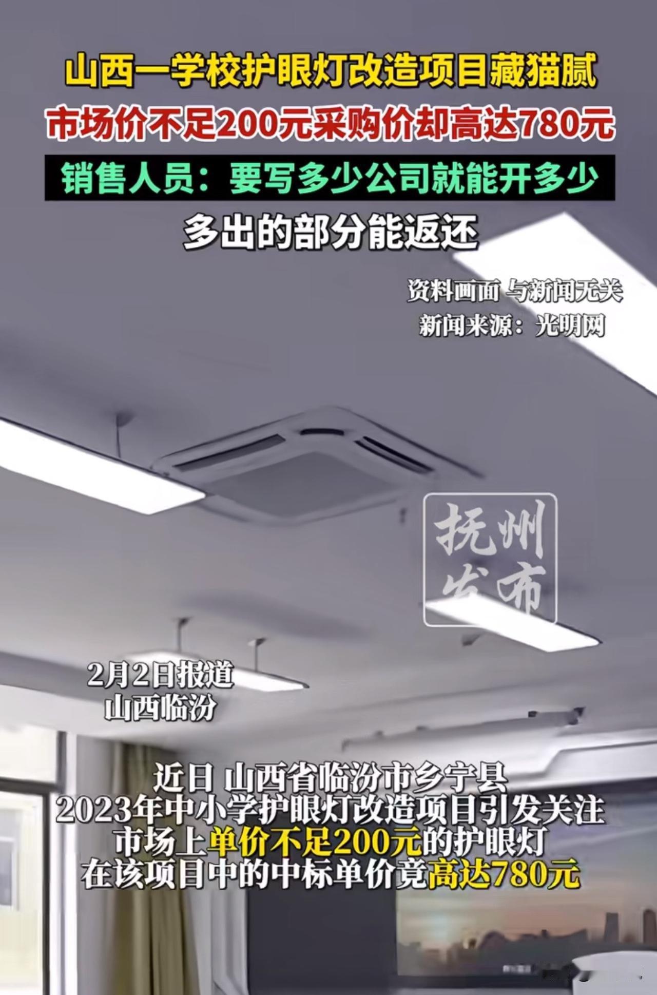 “惊!”山西乡宁中小学护眼灯改造项目,让人大跌眼镜!市场上不足200元就能买到的护眼灯,学校采购价却飙至780元,这离谱价差背后藏着不小猫腻。 更让人咋舌的是,有销售人员直言,采购价格能灵活操作,要写多少就能开多少,多出的部分还能返还。 此事曝光后,网友纷纷吐槽:“这哪里是给孩子护眼,分明是给某些人‘护钱包’!” 更还有网友指责:“财政资金不是大风刮来的,怎能这样糟蹋?” 这事情看下来,周少想说这场看似合规的采购,实则可能是权力寻租的幌子。教育领域的每一分钱,都该用在孩子身上,这样的“高价采购”不仅浪费公共资源,更可能让孩子们本该享有的优质教育保障打折扣。 要知道,教育公平不仅体现在课堂上,更藏在这些细节里。想要杜绝此类乱象,或许得从源头拧紧监管螺丝,让采购流程全程透明,让每一笔支出都经得起推敲。 毕竟,教育领域容不得半点猫腻,守护好孩子的成长环境,才是最该有的“教育初心”。#寻美三湘# #长沙新朋友#