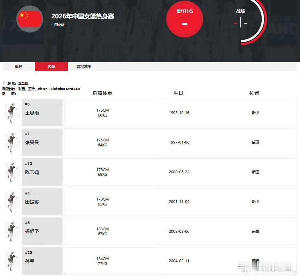 张子宇入选!中国女篮热身赛14人名单揭晓! 北京时间2月3日,FIBA官网公布了中国女篮2月热身赛的14人大名单,其中王思雨和张子宇两名球员为新增入选。具体名单如下: 后卫:王思雨,张曼曼,陈玉婕,田媛媛 前锋:杨舒予,孙宇,李星诺,张茹,罗欣棫,张梓涵,唐子婷 中锋:陈明伶,刘禹彤,张子宇 按照赛程安排,中国女篮将于2月7日和11日分别在合肥市少荃体育中心和宁夏体育馆对阵国际女篮联队。