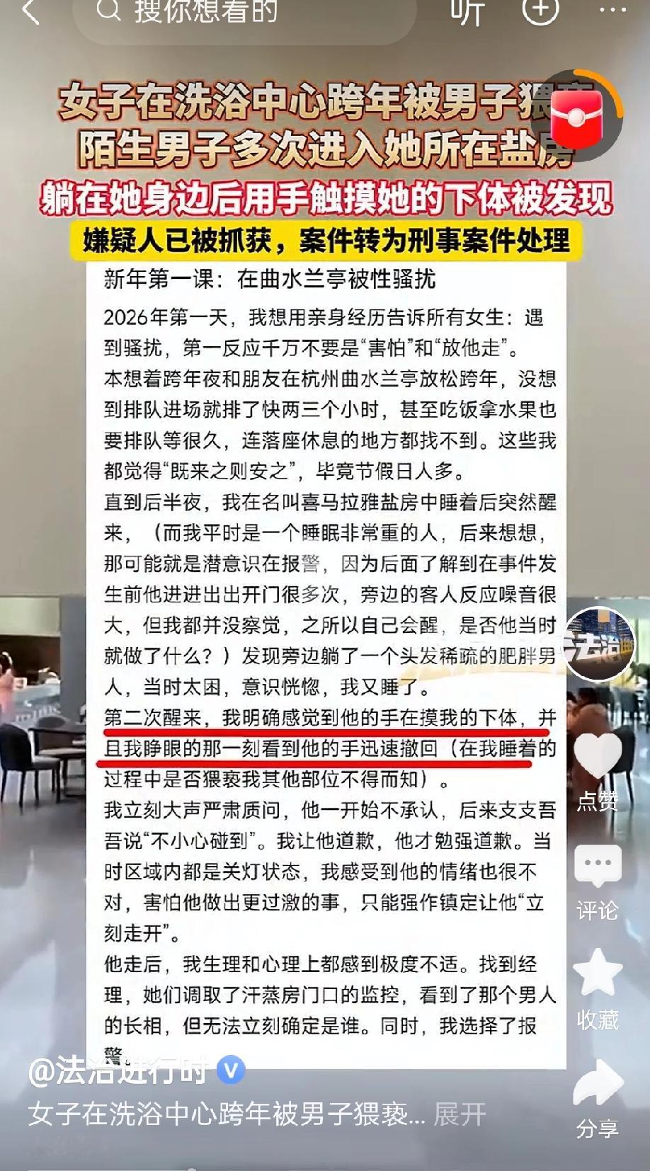 浙江杭州,女子到洗浴中心跨年,半夜在汗蒸房里睡着,醒来发现身边躺了一个头发稀疏、肥胖的陌生男子。女子起初也没多想便又睡了过去了,结果再次醒来,竟然发现对方正在摸自己的下体。女子羞怒不已,让对方道歉后,见对方情绪不对劲,怕遇到危险,强装镇定地让对方离开,而后向洗浴中心说明此事并报警。据悉,目前,涉事男子已经被警方刑拘。 跨年当天,女子和朋友约好一起去这家高端洗浴中心放松,想着赶上元旦连休,花点钱图个舒舒服服,也当是犒劳自己。 刚到店门口,场面就让人犯怵,满眼都是人,排队如长龙一般,光是进个场,就足足等了三小时。 休息区没有座位,餐饮区和水果台也是排得水泄不通,热门菜品前还得接着排,想喝杯热豆浆都得提前半小时领号码。 两人站累了脚,干脆找了个相对安静的盐房歇一歇。女子因为连日疲惫,加上当晚耗体力排队,眼皮刚闭上就进入深度睡眠。 她找了个能靠墙的位置,盖上薄毯后很快进入梦乡,连手机都放在了小桌板上,并没有多做防备。 第一次醒来是在迷迷糊糊中,感觉到身边多了个躺下的人,但她脑子沉得动不了,还以为只是别的客人暂时凑了个位置,就翻了个身又睡了。 谁都没想到,意外就藏在这片昏黄朦胧的安静中。 第二次醒来,是身体传来的冷意提醒了她,有一只粗糙的手,正在触摸她的隐私部位。 她震惊得浑身一紧,猛地抬头,看清了正是刚才那个陌生男人。 对方见她醒了,手立刻缩了回去,脸上一脸慌乱,嘴里含糊说是碰错了位置,但声音发虚,手还在躺椅边上抠来抠去。 女子很害怕,但没有爆发。 她看了一眼昏暗的房间,只有她和对方两人,担心进一步反应会引起更大的危险。 于是她强撑着冷静,强硬要求男子离开。 男子低着头匆忙出门,像逃跑一样,连盖在身上的毯子都忘了拿。 女子坐在原地,半天都缓不过来,后怕和委屈一并涌了上来,眼泪止不住往下掉,整个人发着抖。 她并没有立刻回休息区,而是直接去了前台,找工作人员要调取监控。 工作人员一开始显得很紧张,后来在女子的坚持下同意配合,一起看了监控内容。 画面里,那名男子在女子睡着后,前后反复进入盐房三次,每次都像在踩点。 他先是四处张望,然后站在角落里盯着女子好几分钟,之后才慢慢走过去坐下,再躺下,整套动作非常熟练,仿佛早就盯准了。 看到这段监控,女子更加确定自己不是在做梦,而是实打实地遭遇了一次猥亵。 报警电话拨出去没多久,警方很快赶到,将相关画面和物证带回调查。 在不到24小时内,警方找到该男子并将其刑事拘留,男子最终承认了自己趁女子熟睡时实施猥亵的事实。 整件事传开后引发热议,很多女性网友表示心有戚戚。 她们认为,所谓高端场所并不意味着更安全,洗浴中心内相对私密的汗蒸房、盐房,如果没有及时巡查和安全管理,反而成了风险区域。 事发当晚,该男子在女子睡着时接连进入盐房22分钟之久,却无任何工作人员过问或制止。 如果不是女子心理素质好,选择了巧妙避险并保留了报警证据,后果可能不堪设想。 值得一提的是,该女子事发后主动将遭遇发在网上,提醒她人出门在外提高警惕,也获得了不少人点赞。 她说自己当初并没有砸场子,没有大喊大叫,是因为知道光喊不解决问题,还可能让事情更恶化。 她不是怕事的人,只是清楚,在这样的地方,一旦遭遇危险,自保优先,留证为后。 这件事也说明一个问题,所谓的女性自我保护教育,只靠临场反抗是远远不够的,关键在于平时场所管理制度是否到位,监控是否及时、人员是否巡查,尤其是这类偏私密、又允许陌生人混合使用的空间。 虽说公共区域天经地义要有包容性,但包容不能成为管理放松的借口。 对于消费者来说,花了近千元进一个所谓高端的洗浴中心,不是为了冒险,而是为了放松。 既然能做到收费高,那安全服务也该配得上这份价格。 希望这件事之后,相关场所多上一道锁、多一份责任。 女子所处的环境、人群的麻痹松懈、值守的空白、室内昏暗的灯光,这些因素凑在一起,才给了不法之人机会。 不能靠个案去唤起重视,更不能等下一次受害者站出来才追悔莫及。 涉事男子已经被依法追责,这一点令人欣慰,对女子也是一个最起码的回应。 从头到尾最清醒的,是受害者本人,她沉住了气,也保住了证据。 这在不对等的环境下,是最难能可贵的冷静。