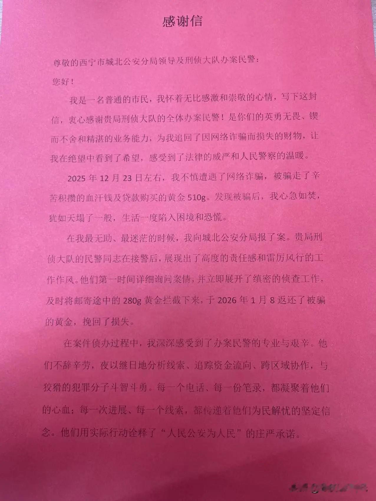 西宁两市民寄出的430克“黄金包裹”被公安半途紧急截停追回,太悬了! 太险了!西宁两位市民差点把攒了一辈子的钱拱手送人。许女土和阿先生听信了网上“高回报投资”的谎话,一个买了280克黄金,一个买了330克,都按骗子吩咐寄了出去。 那可是实打实的金子啊!体积小,值大钱,一转手就难追了。城北反诈中心警报一响,民警立刻动了。他们一边联系快递公司总部,紧急锁定包裹路线;一边派人连夜赶往中转城市,布下天罗地网。 就在快递飞奔的途中,拦截网收紧了!两个金包裹被成功截停,总共430克金子,完完整整追了回来。 拿到失而复得的黄金,许女士眼泪直掉:“要不是你们这么快,我一辈子的积蓄就没了!” 为反应神速的民警点赞!也为警企联动的效率点赞!守住钱袋子,就得这样争分夺秒!大家也要警惕,天上不会掉馅饼,陌生链接、高额回报,千万别轻信!