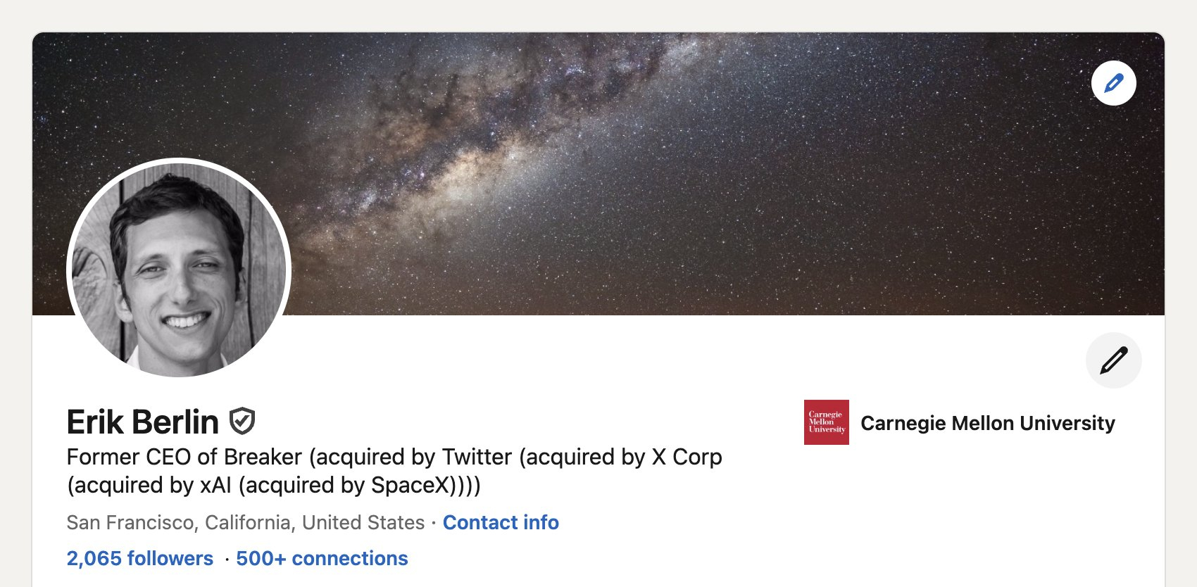 烂梗但也是事实...Elon Musk 在过去 4 年里收购了 Twitter 3 次,有没有第 4 次就看特斯拉会不会收购 SpaceX 了。