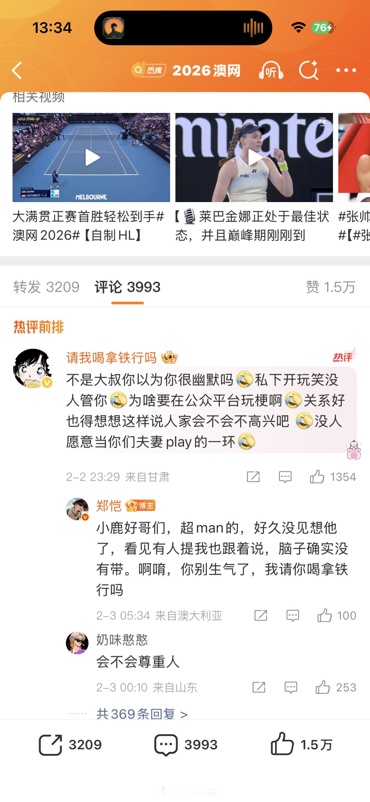 郑恺苗苗观赛澳网分享了日常,网友问郑恺旁边的人是谁,有网友打趣是鹿晗,于是郑恺也说是鹿晗,现在鹿晗粉丝要郑恺道歉,并称他是郑姨