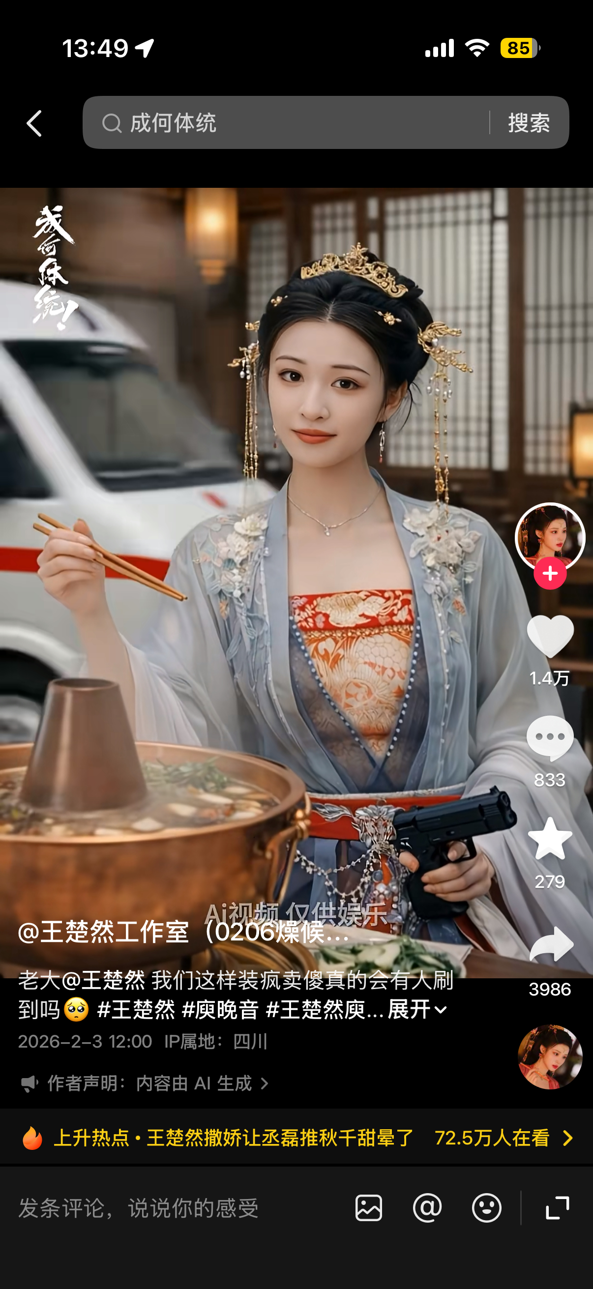 王楚然工作室用AI为新剧《成何体统》剧宣,对家看到这样的工作室都释怀了。我命由我不由天,火锅妖妃你真癫,心疼王楚然。