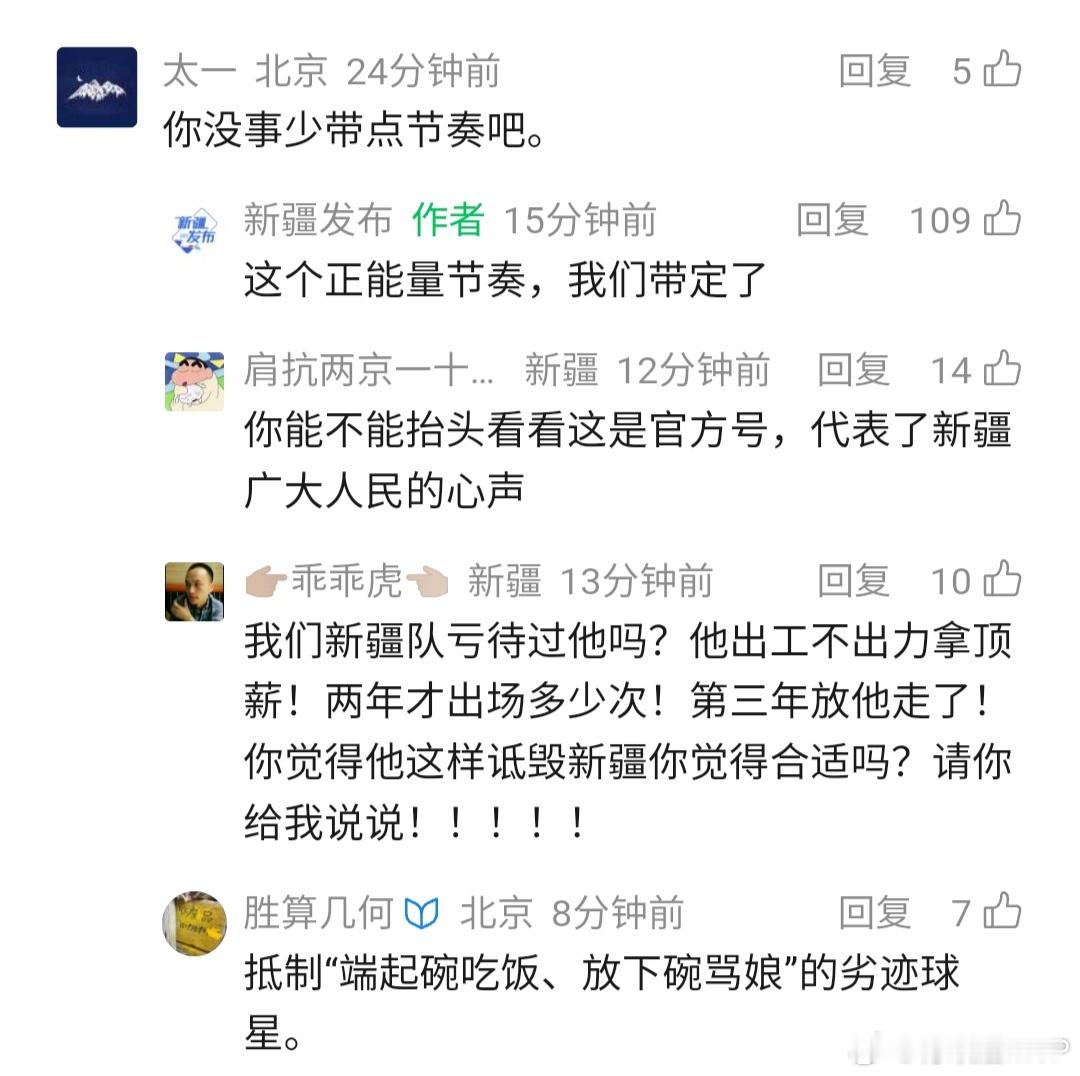 “竞技状态有好有坏,比赛失利难免会心里沮丧,这再正常不过;面对外界评价,谁都会有情绪变化,也可以理解。但是,人的一生,最难的就是情绪管理,成功最需要的也是情绪管理,有影响力的公众人物一举一动不只是代表自己,更有着很强的示范效应,守住言行就是公众人物守住行业道德和公序良俗的第一关”。新疆发布的良言规劝说得很到位