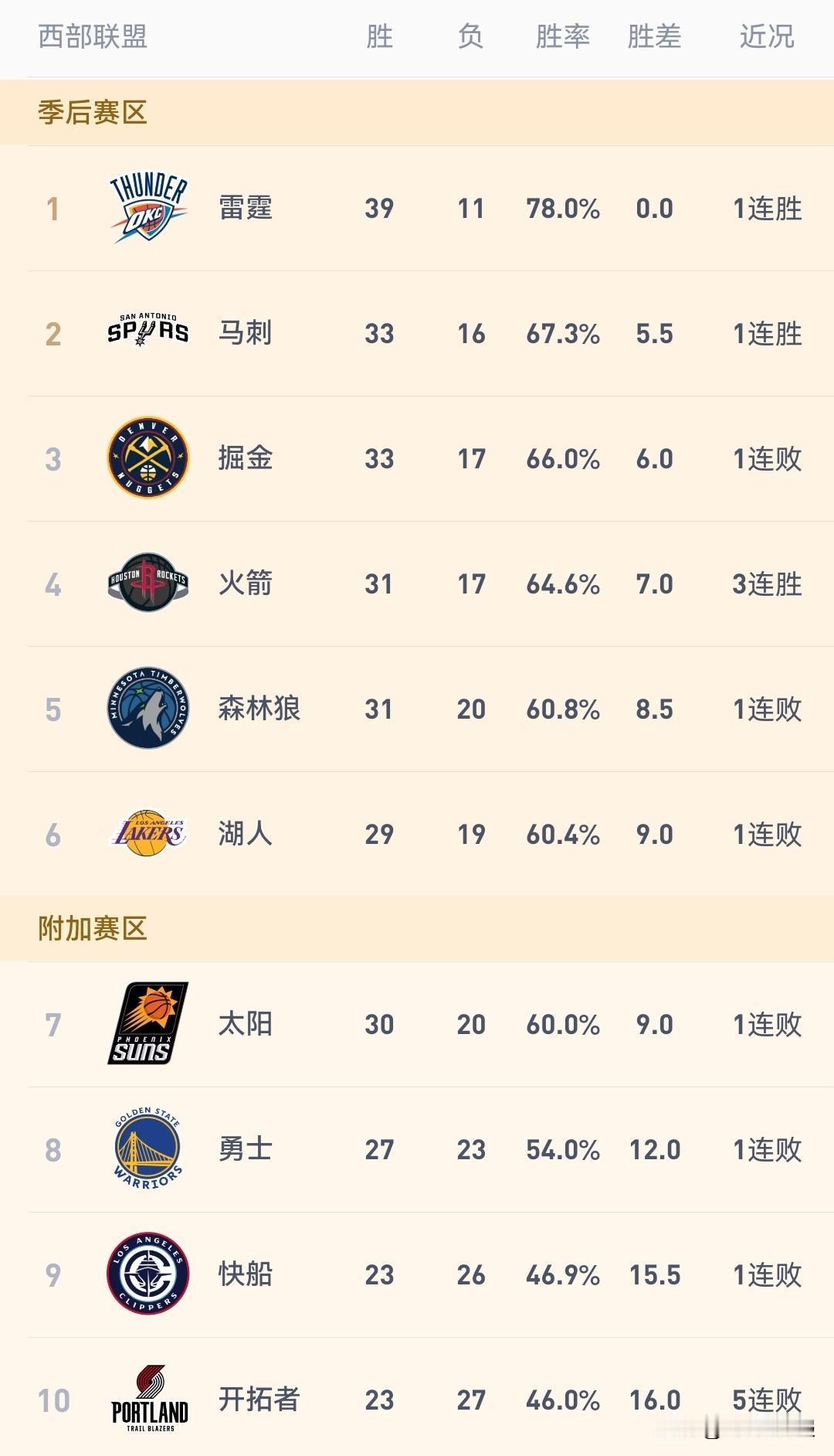 未来10天掉到第几?全明星赛前火箭还要打5场,对手分别是凯尔特人、黄蜂、雷霆、快船*2,没有一个软柿子——凯尔特人目前二连胜,高居东部第三;黄蜂近期七连胜,曾战胜过西部前三的雷霆、马刺、掘金;雷霆就不用多说,本赛季两次战胜火箭,最近一场更是大比分获胜;快船近22场17胜5负,是联盟同期战绩最好的球队,12月24日火箭曾以108-128大比分负于快船。值得一提的是,火箭核心杜兰特由于脚踝扭伤已经缺阵一场,未来何时复出仍没有确切消息,好消息是,杜兰特本赛季缺阵的三场,火箭全部赢球,如果未来5场能拿下3场,火箭将在全明星赛前稳住西部第四的位置。 森林狼全明星赛前5场对手:猛龙、鹈鹕、快船、老鹰、开拓者,赛程相对简单,只有猛龙一支球队胜率超过五成。 湖人全明星赛前5场对手:篮网、76人、勇士、雷霆、马刺,赛程难度较大,只有篮网胜率低于50%。 太阳全明星赛前5场对手:开拓者、勇士、76人、独行侠、雷霆。如果布克和杰伦格林能及时复出,太阳有能力拿下过半胜场。 掘金全明星赛前5场对手:活塞、尼克斯、公牛、骑士、灰熊。约基奇、瓦兰复出,掘金接下来会和马刺争夺西部第二,未来五场他们有能力全部拿下。 马刺全明星赛前5场对手:雷霆、独行侠、独行侠、湖人、勇士。马刺目前领先掘金0.5个胜场排名西部第二,与掘金一样,未来五场他们不虚任何对手。