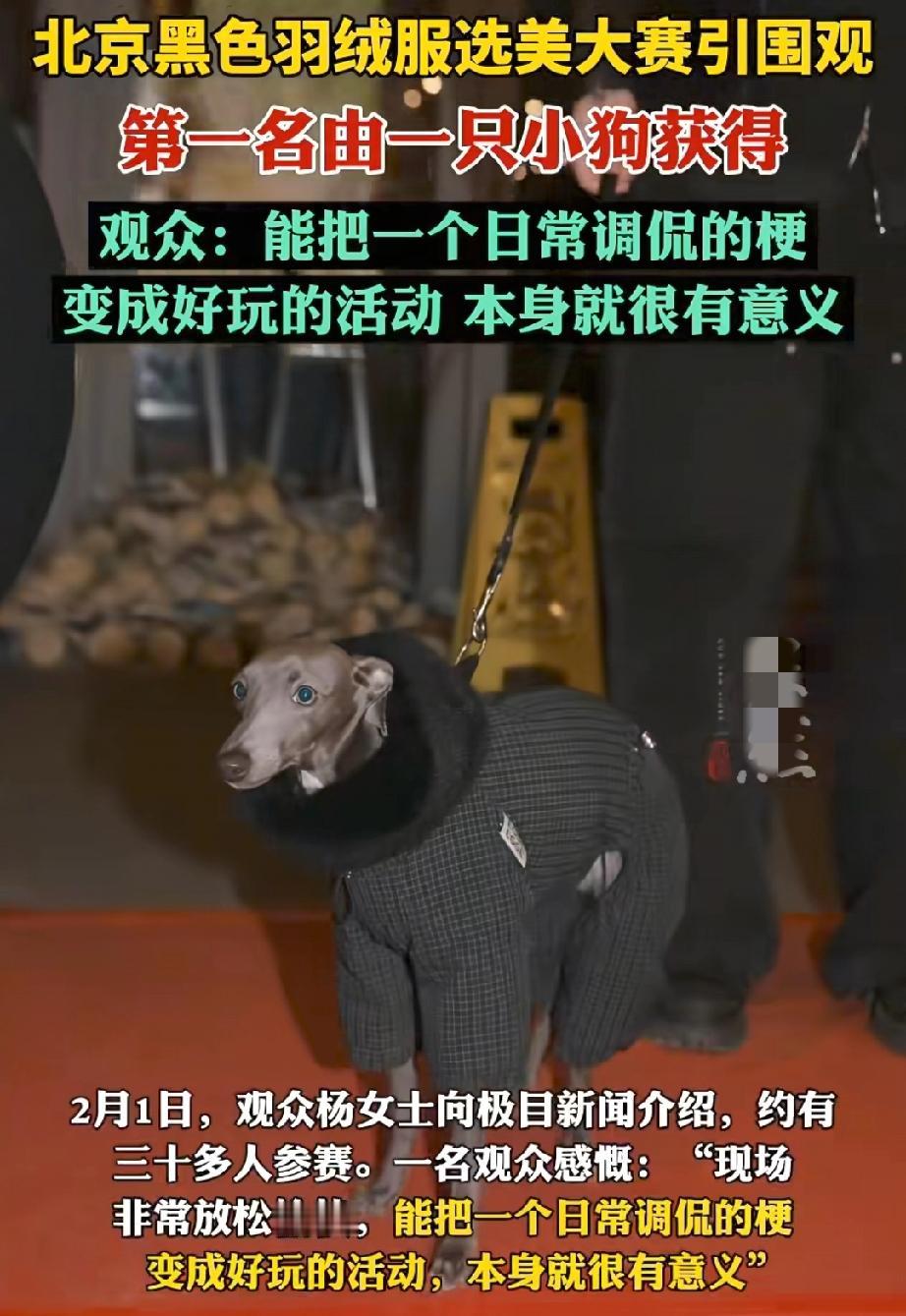北京举办第一届黑色羽绒服选美大赛,结果一只狗成了冠军,不得不说北京人真是太幽默了。 大家都知道到了北京黑压压的到处都是穿黑色羽绒服的人,仔细一看人家穿的还都是名牌,不愧为一线大城市。 这项活动由一个博主樊女士发起来的,心血来潮发起了黑羽绒服比美活动,本来觉得能来十几个人就差不多了,没想到各行各业的很多人参加。 北京人的精神状态还是太超前了,大家聚在一起很快乐,展示了自己,最后第一名给了穿黑衣服的小狗。