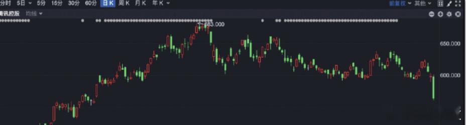 腾讯股价平开,但随后一路向下,截至发稿股价最低报561港元,最大跌幅达6.27%。