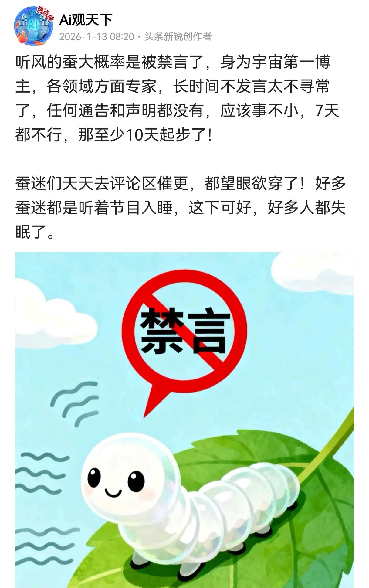 听风的蚕大概率是摊上事了,当时我发文就说他大概率是被禁言了,身体再不好也不应该不发作品,哪怕是来开直播露个脸呢?现在看他粉丝疯狂下滑,平台数据异动,更印证了“被禁言”的猜测,只是没到全网封杀的地步,背后大概率是踩线后的阶段性处罚。 至于他说的身体原因根本站不住脚!以前带病也更新呀,他之前可是多次强调“把粉丝当电子战友”,在病榻上都坚持创作,真要是单纯养病,绝不会连一句交代都没有。