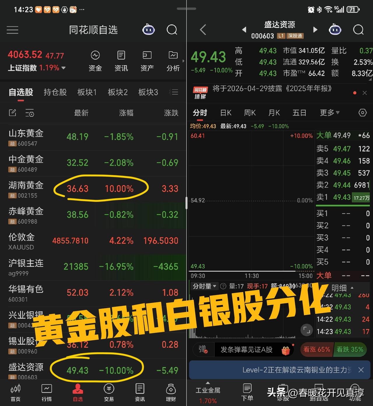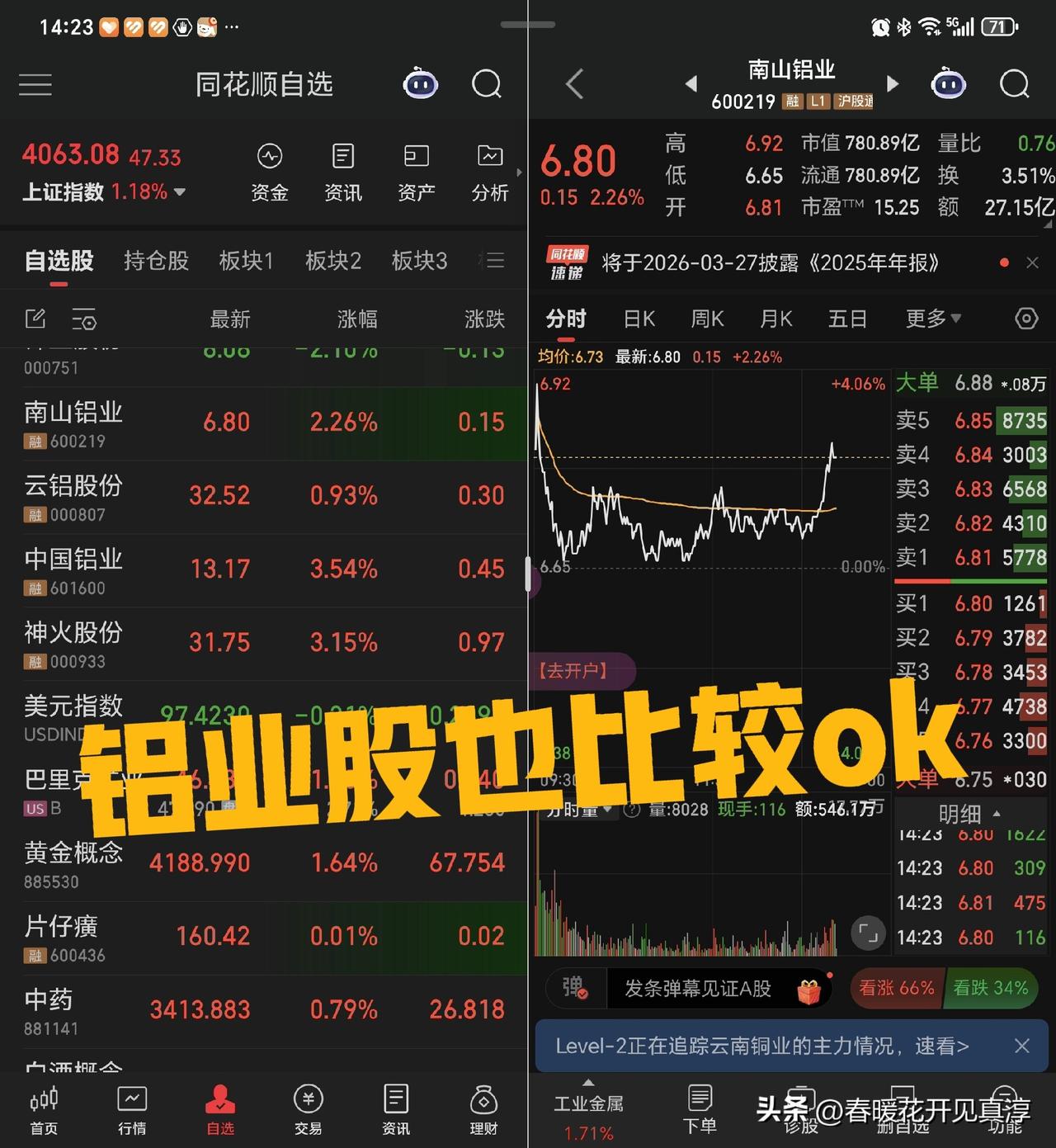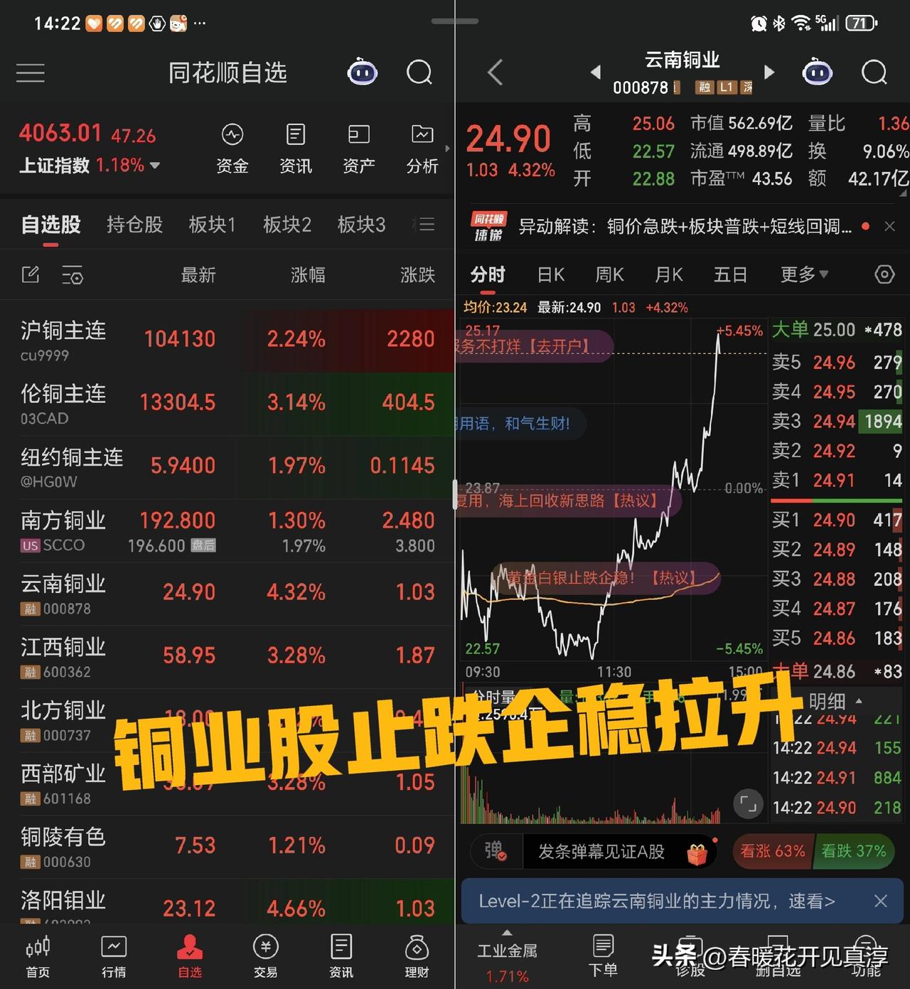 目前来看,铜业股和铝业股已经止跌回升,黄金股和白银股大面积分化,湖南黄金继续封涨停,盛达资源继续封跌停,其他黄金股涨跌互现。 沪铜和伦铜都涨起来了,期货的价格回暖是一个风向标。 云南铜业、江西铜业、铜陵有色、北方铜业以及南山铝业、中国铝业都涨起来了。也就是铜铝行情仍然继续。 券商,我看记前两天长江证券下跌之后,华泰证券今天又不太正常,然后我今天看了国投瑞银基金,对于白银的一个lof的争议查了一下,果然是国投资本下面信托公司的一个合作基金,其实对公司影响应该有限。 距离过年没有几天了,估计还是红红火火过年的节奏。
