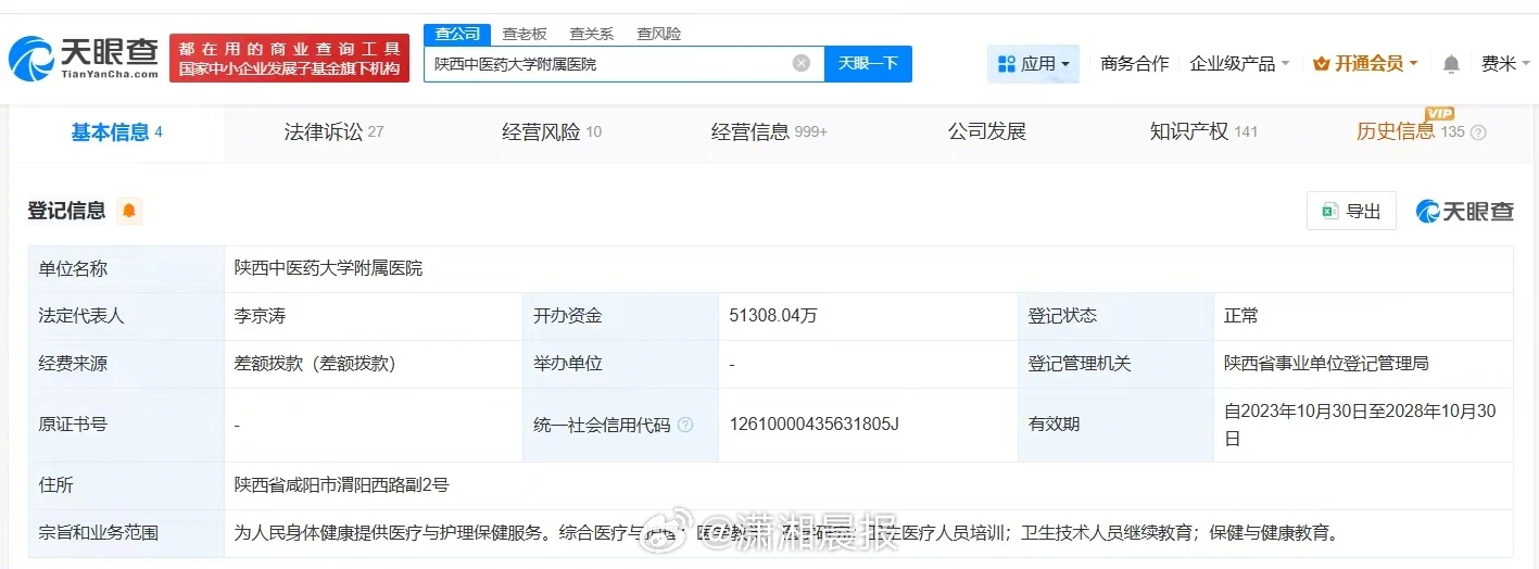 【#揭秘直播暴露女患者隐私部位涉事医院#,#陕西中医药大学附属医院曾多次被罚#】#医院直播被指暴露女患者隐私部位#据媒体报道,近日,多名网友在社交平台曝光,称陕西中医药大学附属医院妇二科在网络平台直播做手术,画面中直接出现女性患者隐私部位,多名网友举报后,直播中断。2月3日,涉事医院回应称,医院已经关注到此事,目前正在处理中。记者查询天眼查发现,涉事医院陕西中医药大学附属医院法定代表人为李京涛,开办资金约5.1亿人民币,宗旨和业务范围包括综合医疗与护理、医学教学、医学研究等。法律诉讼信息显示,该医院曾因医疗损害责任纠纷、名誉权纠纷、健康权纠纷等被起诉。经营风险信息显示,该医院现存多条行政处罚信息。 陕西