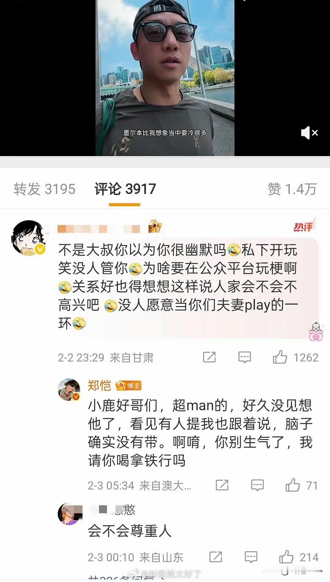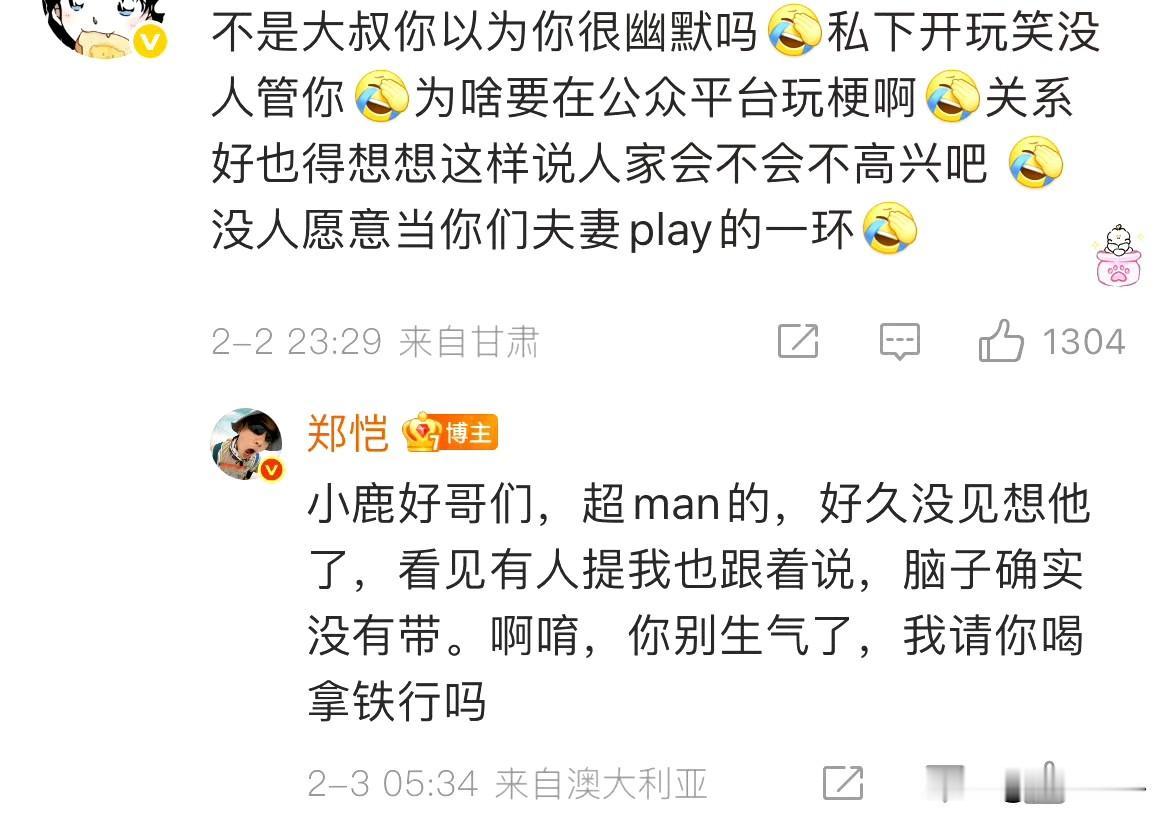 鹿晗粉丝和郑恺杠上了 2月2日,郑恺晒与苗苗的日常vlog,网友在评论区问最后的女人是谁,郑恺也很难评,把自己老婆说成是鹿晗 ,鹿晗粉丝觉得他很不尊重人。 鹿晗粉丝认为,明明视频里是自己老婆苗苗, 非要拿鹿晗来玩梗,谁看了不觉得郑恺这波很败好感!私下兄弟玩笑无伤大雅,本质就是不尊重人。 2月3日郑恺道歉:小鹿超man!好哥们!请喝拿铁赔罪跑男兄弟情这波主打一个嘴比脑快,拿铁到位啥都好说。 有的粉丝说,“拿铁”这个梗,影射鹿晗咖啡店副业感觉缺乏诚意,应该像鹿晗和苗苗道歉。 还有的粉丝说:真性情也是需要在尊重人的前提下,如果让人感到冒犯,那真性情不过是没礼貌的伪装,不想想兄弟,也考虑一下老婆的感受吧。 大家觉得呢?明星可以随意开玩笑吗?