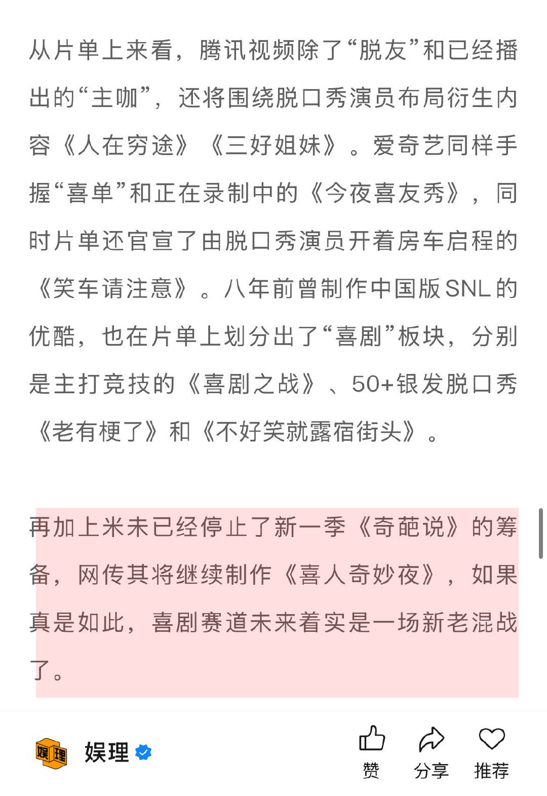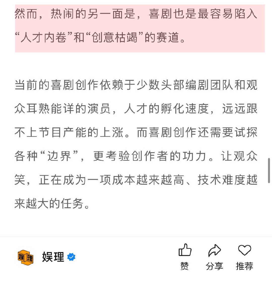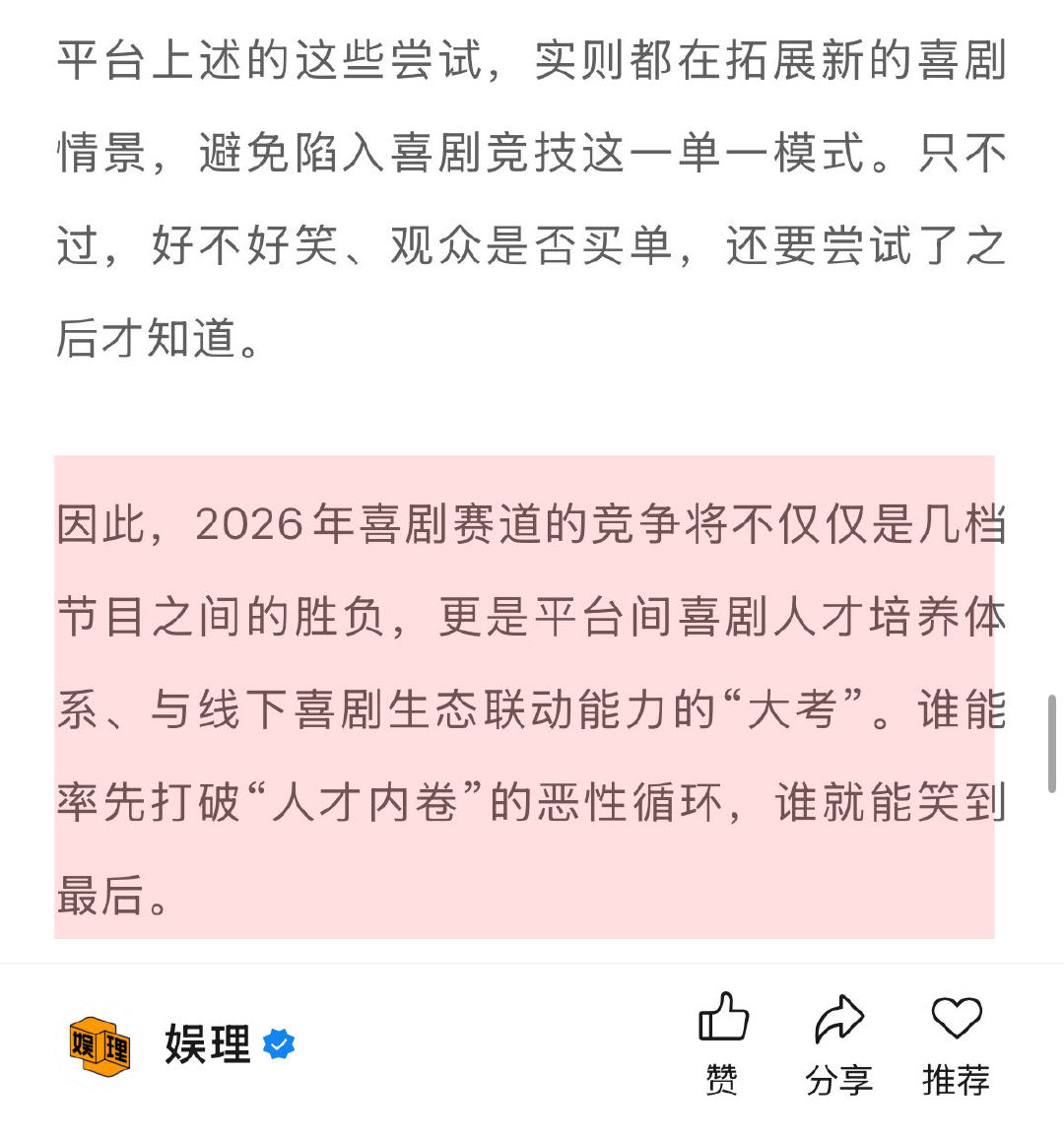 四大平台140档综艺靠谱吗 预算收紧明星真人秀为何仍被选择 喜剧看似是最安全的情绪出口,却同样是最容易人才内卷、创意枯竭的领域。当前创作高度依赖少数头部编剧和熟脸演员,人才孵化速度远追不上节目扩张节奏,平台一边拓展“银发脱口秀”“房车喜剧”等新场景,一边还要不断试探表达边界,让观众笑这件事的成本和难度都在攀升。 娱理独家↓