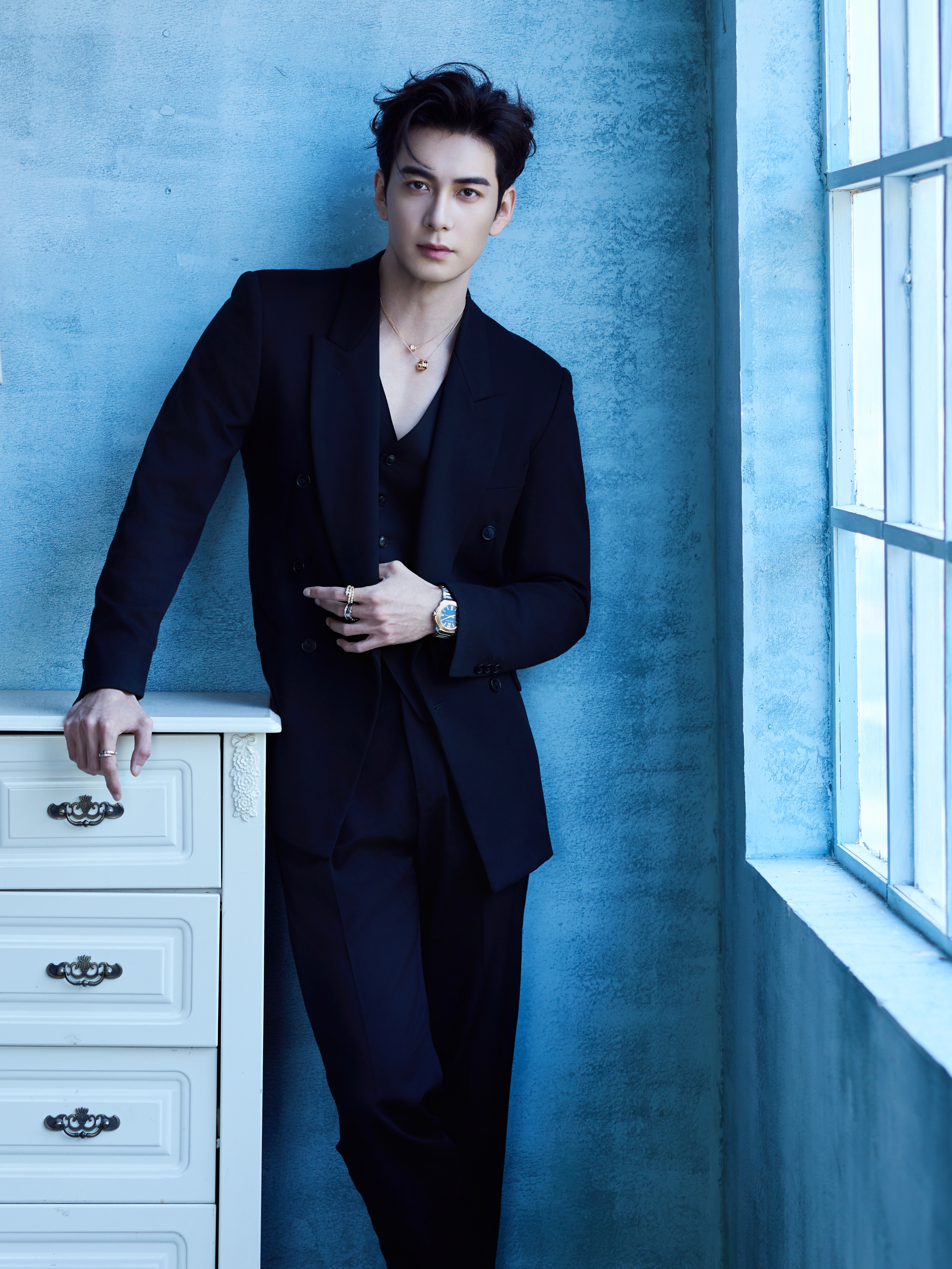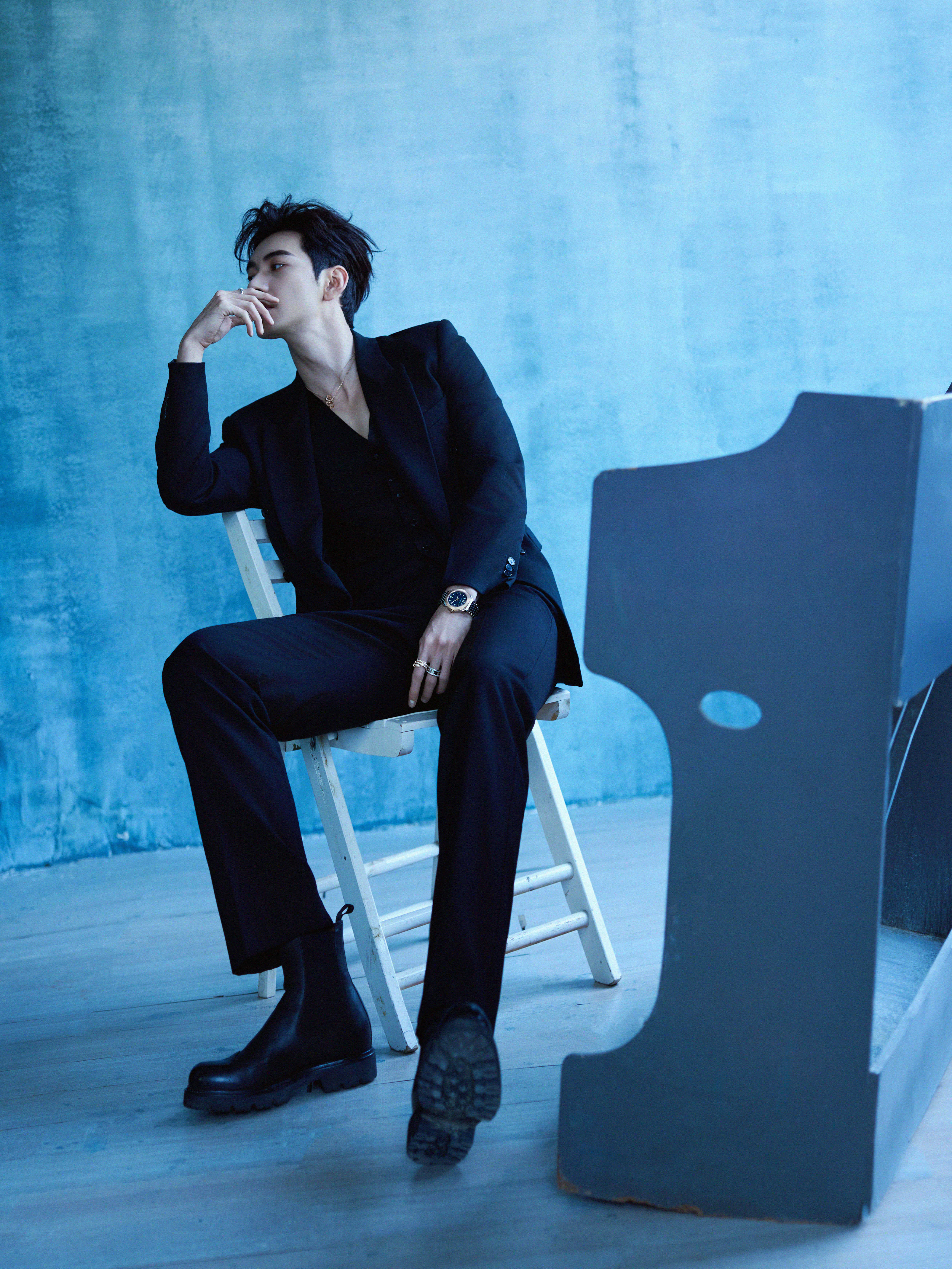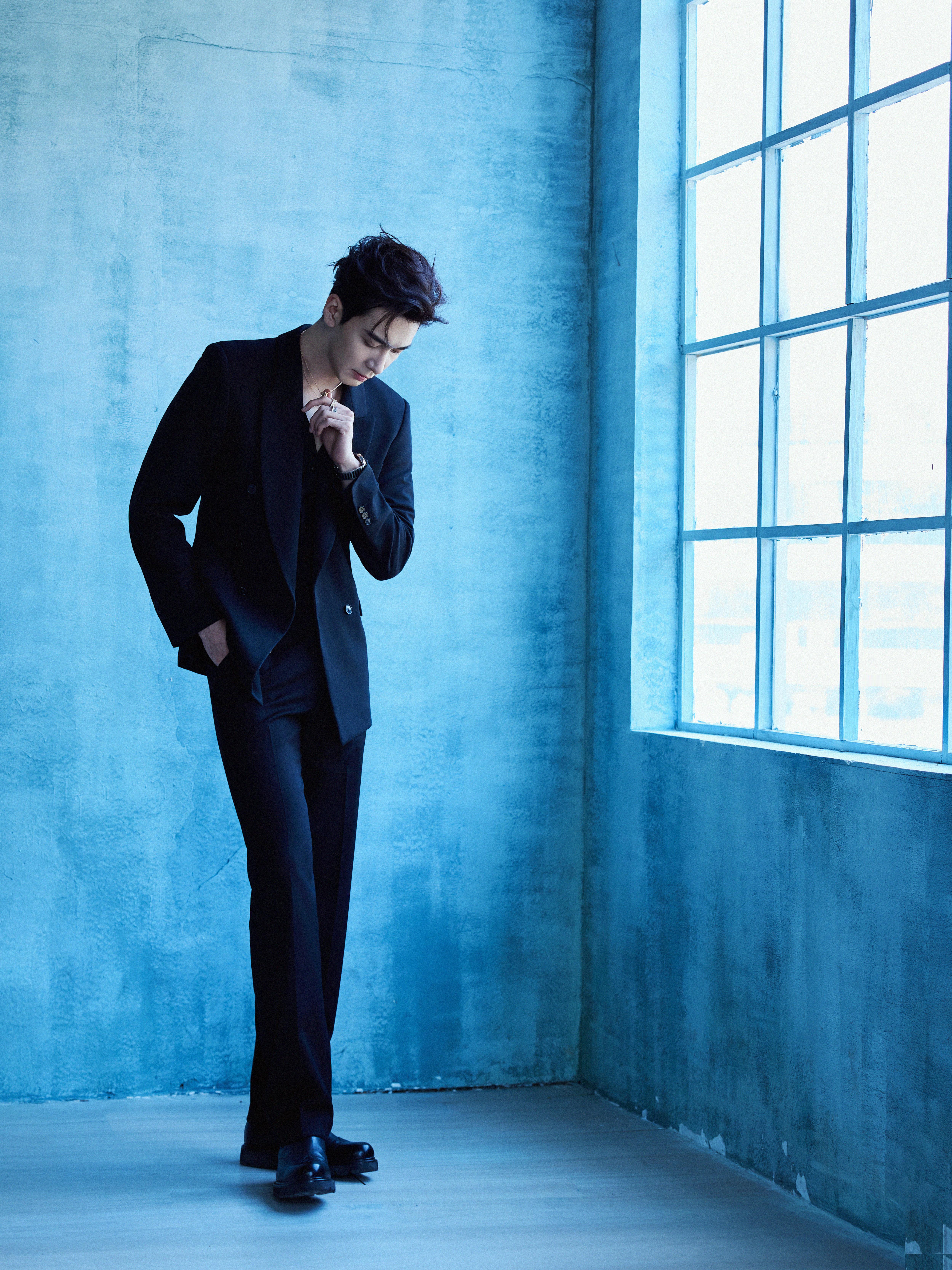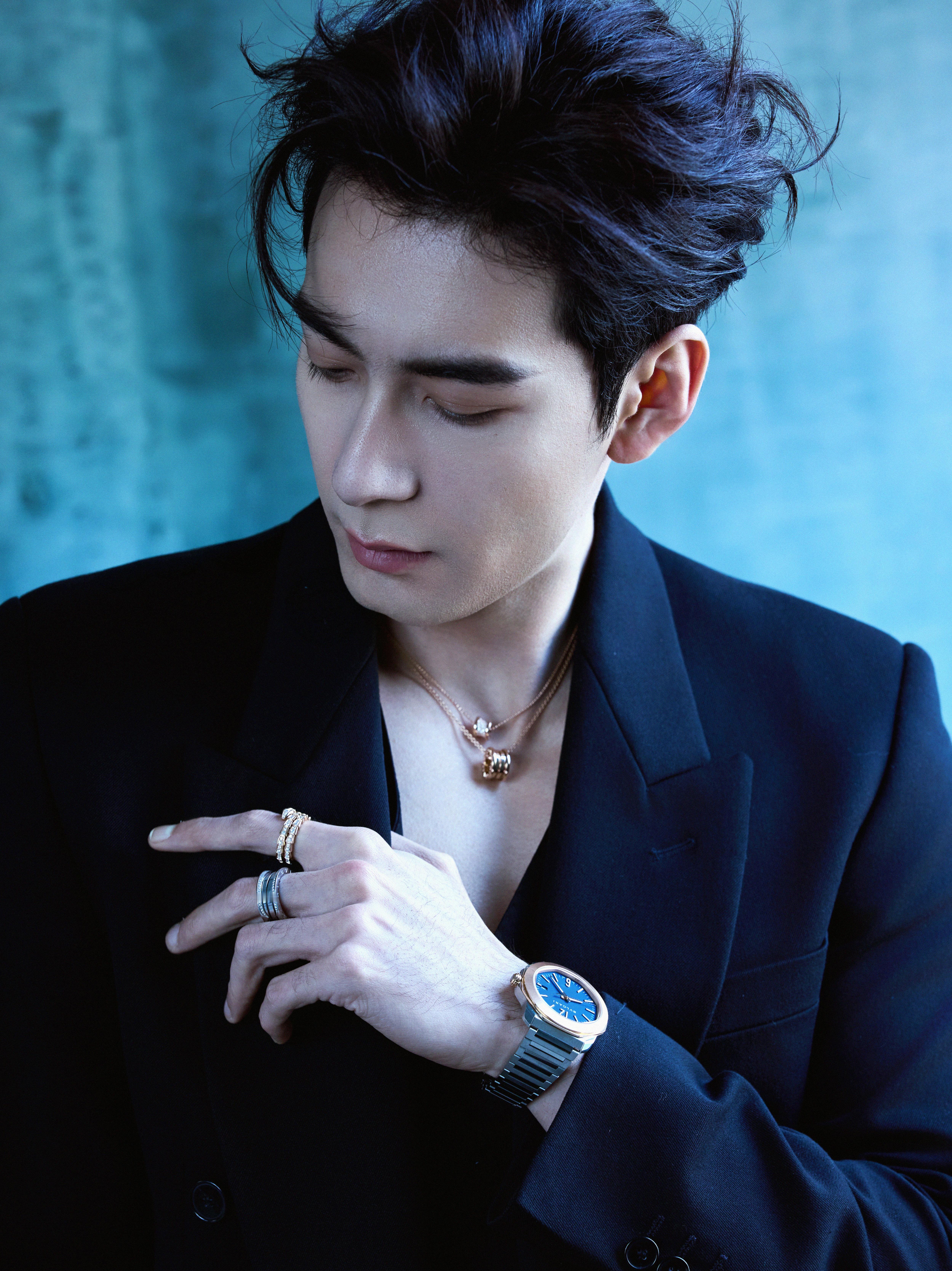 陈星旭 📸 一组优雅静谧的造型大片,修身裁剪的V领西装搭配 BVLGARI 珠宝腕表出镜,置身蓝色空间,尽显冷峻潇洒的型男风范🎹💙风格大赏