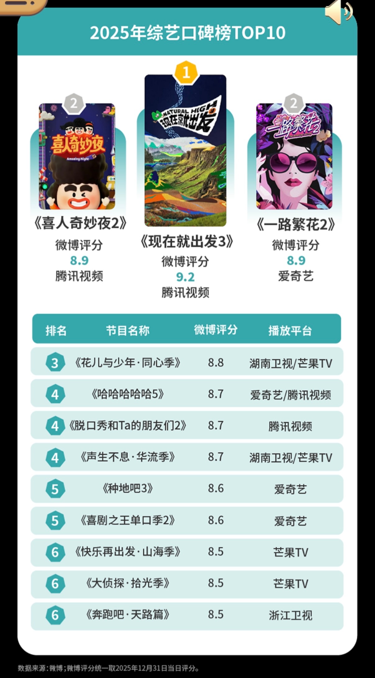 2025年综艺节目影响力榜TOP202025年综艺口碑榜TOP102025年综艺口碑榜TOP10现在就出发3、喜人奇妙夜2、一路繁花2、花少7、五哈5、脱口秀、种地吧3、喜单、快乐再出发、大侦探、奔跑吧