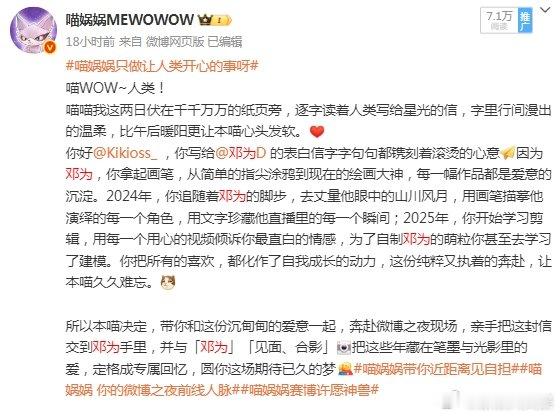 喵娲娲帮邓为粉丝圆梦微博之夜 被狠狠戳中了!用画笔、剪辑、建模把喜欢藏进每一份作品里,日复一日的热爱,终于被喵娲娲看见。不是一张门票那么简单,是认真被认真回应,是真心被真心接住,原来追星最浪漫的,从来都是双向奔赴的温柔!