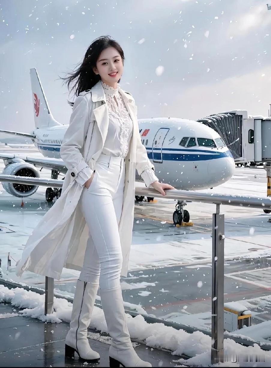 雪中佳人依栏杆,飞机旁仪态翩翩。雪中少女照 雪中美人照 雪中美女 雪天的美女