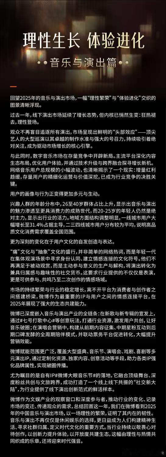 2025年微博十大热搜演唱会 《2025微博音乐与演出白皮书》正式发布时代少年团、汪苏泷、鹿晗、周深、张杰、王源、华晨宇、易烊千玺、刘宇宁、张艺兴十场演唱会承包热搜记忆。数据见证高光,舞台定义流行。2026年,期待更多视听盛宴诞生!