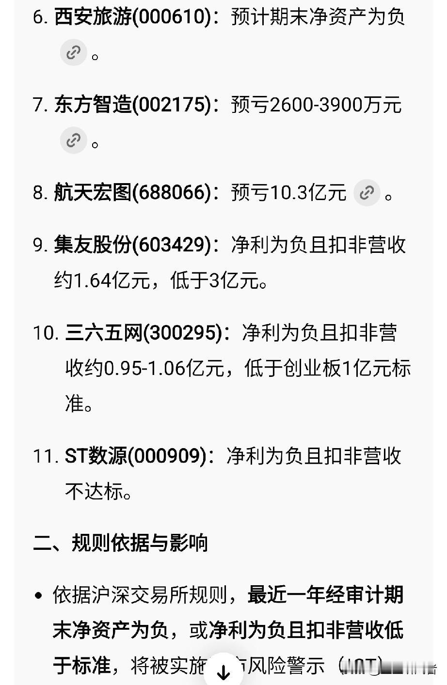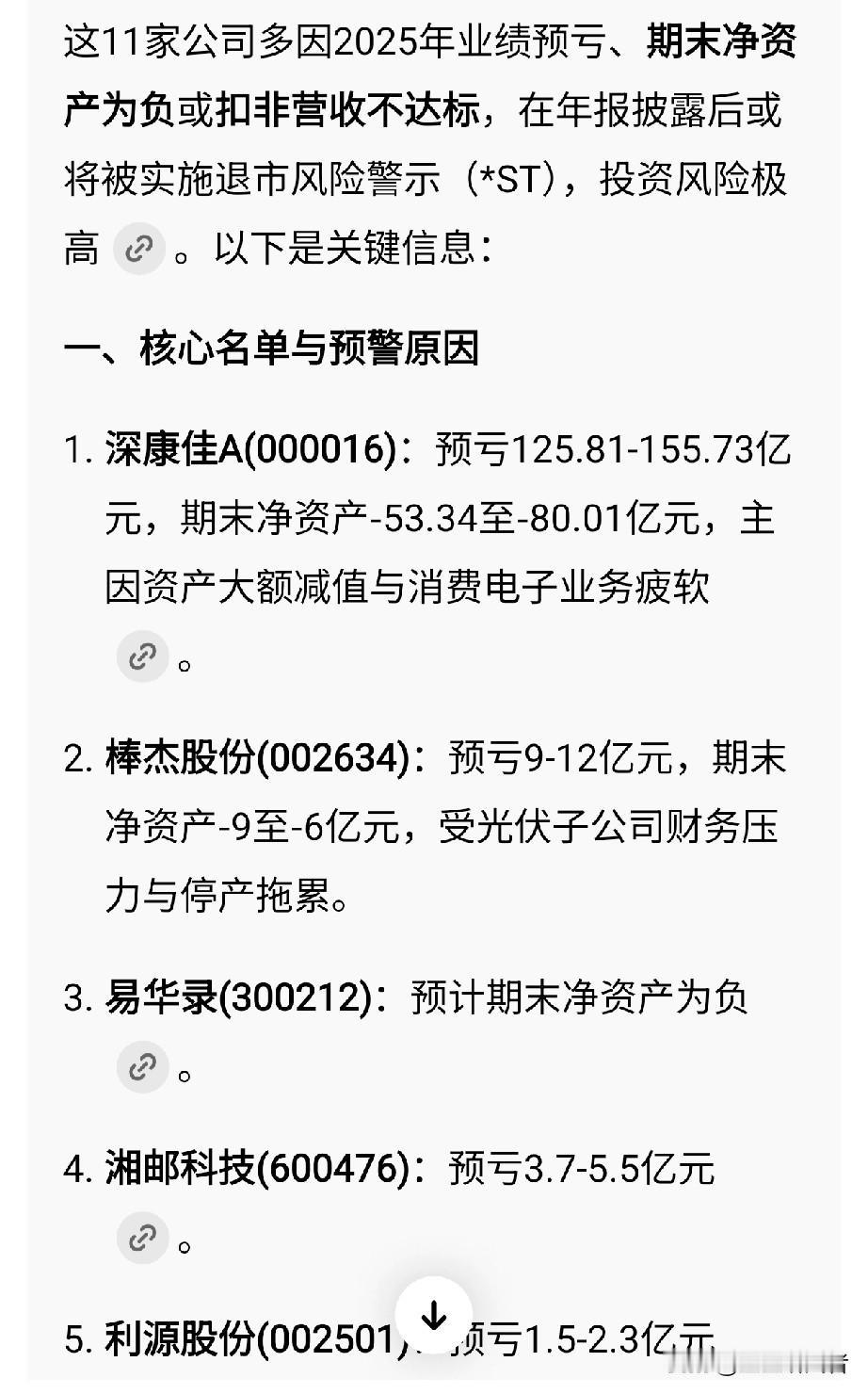 A股大预警!11家公司要戴“*ST帽”,深康佳已连续跌停,持仓的赶紧看! 最近炒股的朋友可得擦亮眼睛!11家上市公司因为业绩亏得太狠、家底赔光,或者营收不达标,年报披露后大概率要被贴上“*ST”的退市风险标签,这可不是小事,一不小心就可能血本无归! 先说说最惨的深康佳A(000016),之前大家都熟悉的老牌家电股,这次预亏直接冲到125亿-155亿,家底都亏成负数了,净资产最少亏没53亿!受这消息影响,已经连续两天开盘就跌停,2月2日和3日直接封死跌停板,想卖都卖不出去,现在股价只剩4块多,手里有这只股的股民真得急坏了。 除了深康佳,还有10家公司也在风险名单里:棒杰股份预亏9-12亿,净资产也是负数;易华录、西安旅游家底都赔光了;湘邮科技、利源股份、航天宏图这些也亏了好几亿;还有集友股份、三六五网,不光赚钱为负,营收也没达到交易所要求,直接触发预警线。 可能有人不懂“*ST”到底啥意思,说白了就是公司经营出大问题,交易所给它戴个“风险帽子”提醒大家。一旦戴上这顶帽,股票交易就变规矩了:普通股票一天能涨能跌10%,*ST股直接限制到5%,想靠反弹回本难上加难 。而且以后要是还没改善,下一步就是暂停上市,再不行就直接退市,到时候股票可能变废纸,想卖都没地方卖 。 给大家提个醒:这些股票现在风险已经炸锅了,深康佳就是例子,连续跌停根本跑不掉。手里持有的赶紧盯紧公司后续公告,看看有没有整改计划,该止损就别犹豫;没持有的千万别想着“抄底捡便宜”,这些公司基本面都烂了,一不小心就套牢在里面。 股市里安全永远第一,别被所谓的“重组预期”“摘帽希望”骗了,这类高风险股真的碰不得!觉得提醒有用的,赶紧转发给身边炒股的朋友,避免更多人踩坑~st股风险预警 A股市场 今日A股 散户炒股日记