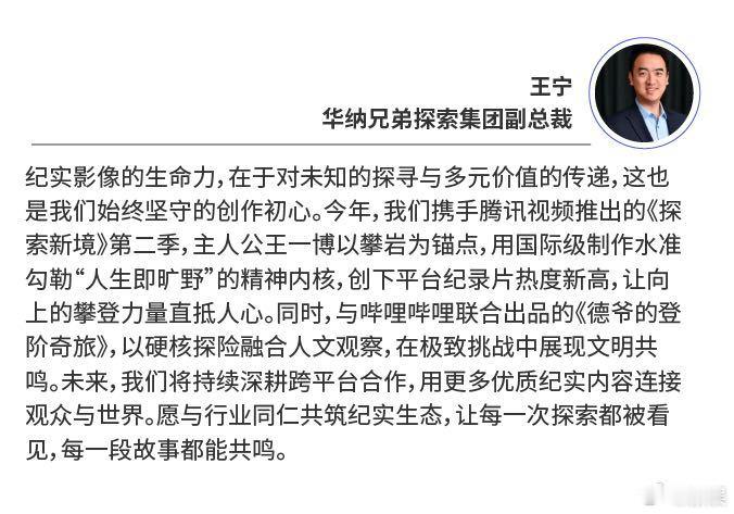 华纳副总裁评价王一博探索新境 被华纳副总裁王宁这番话戳到心坎里了,果然《探索新境》第二季能火不是没道理的!王一博以攀岩为切口,把“人生即旷野”的精神内核具象化,每一次攀爬都像是在诉说对未知的渴望,这种真实又有力量的表达配上国际级制作的镜头语言,想不打动人都难~
