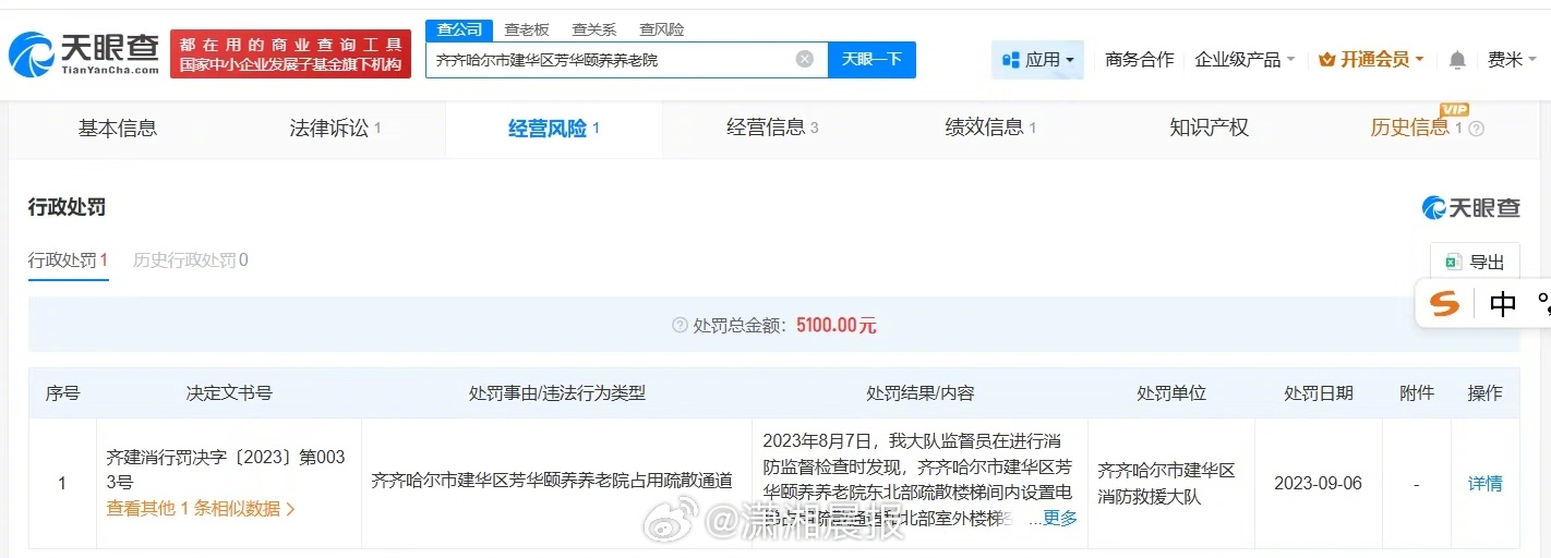 【#起底火灾致5死涉事养老院#,#火灾致5死养老院曾占用疏散通道被罚#】#官方通报齐齐哈尔一养老院火灾#据媒体报道,2月2日15时许,齐齐哈尔市建华区芳华颐养养老院发生火灾,消防、应急、卫健等部门迅速赶赴现场开展救援。15时19分,现场明火被扑灭。事故造成5人遇难。事故原因调查等工作正在进行中。记者查询天眼查发现,涉事养老院齐齐哈尔市建华区芳华颐养养老院成立登记日期为2019年7月19日,法定代表人为李翠翠,开办资金3万人民币,业务类型包括为老年人提供生活照料、医疗康复护理、精神慰籍、文化娱乐等服务。经营风险信息显示,该养老院曾因占用疏散通道,被齐齐哈尔市建华区消防救援大队罚款5100元。 齐齐哈尔