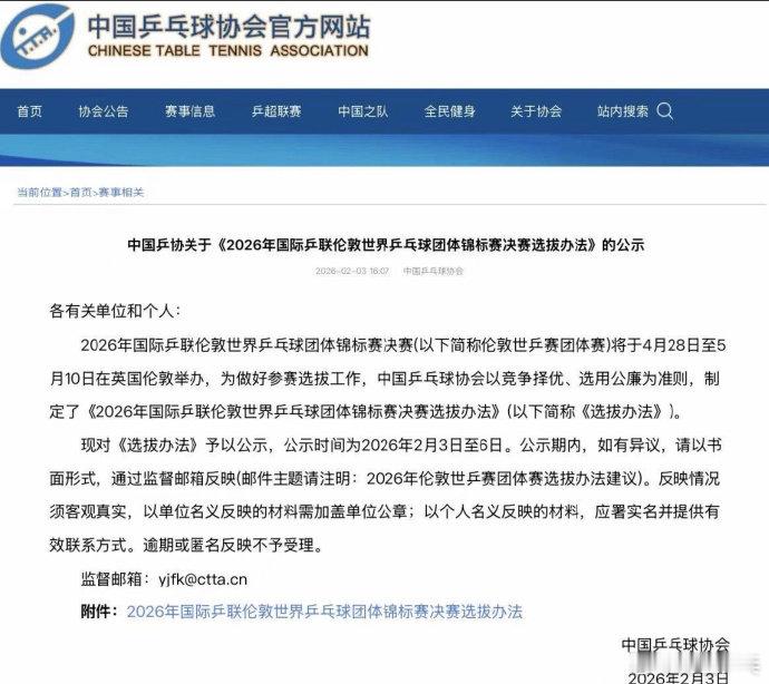2月3日,中国乒协在官网公示了《2026年国际乒联伦敦世界乒乓球团体锦标赛决赛选拔办法》。