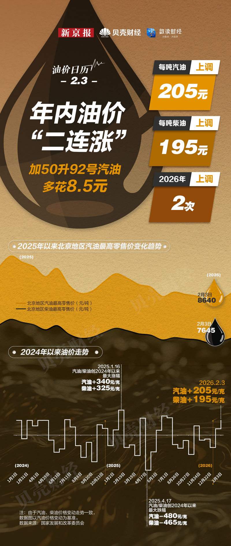 据国家发展改革委消息,自2月3日24时起,国内汽、柴油价格(标准品)每吨分别上涨205元和195元。折合成升价,每升92号汽油、95号汽油和0号柴油的升幅分别在0.16元、0.17元、0.17元。本次调价是今年第三次调价,也是第二次上调。本次调价过后,2026年成品油调价将呈现“两涨零跌一搁浅”的格局,今年国内汽、柴油价格每吨累计上涨290元和280元。北京地区汽油最高零售价8640元/吨,柴油7645元/吨。
