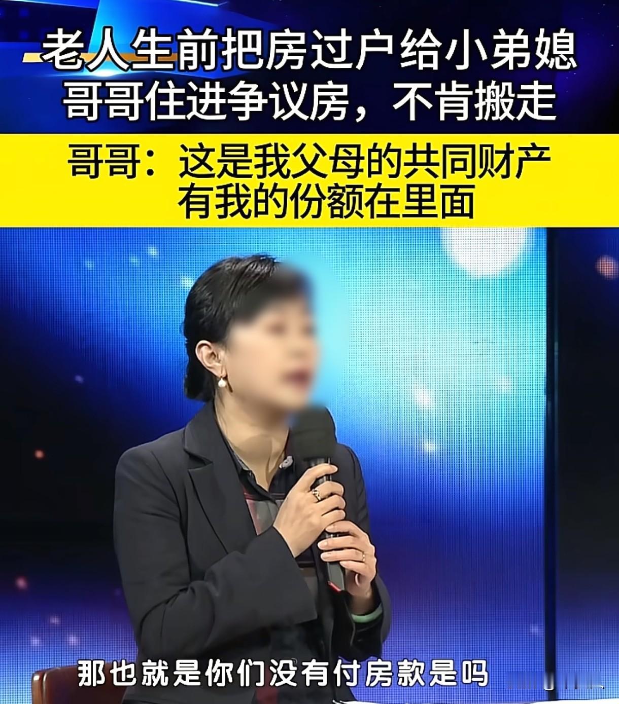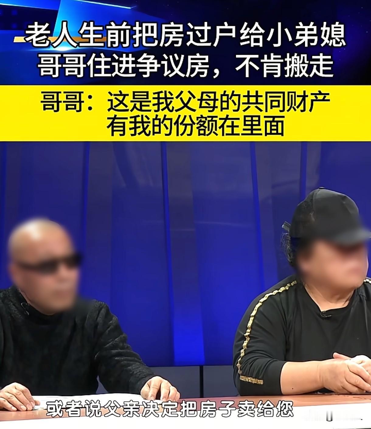 “这就是人性!”北京,老夫妻生了两个儿子一个女儿,却把房子过户给了小儿媳,小儿媳说是因为他们夫妻孝顺,所以公公才以20万把房子卖给了他们,他们还要求大哥从房子里搬走。大哥却提出质疑:父亲曾说过这房子我们兄弟一人一间,再说里面还有母亲的份额,我最少都能分六分之一,为什么要搬?弟弟弟媳把大哥告上法庭,双方打了10年官司,结局令人意想不到。 李先生和尹女士找到调解节目,说父亲把房子卖给了他们夫妻,可大哥不认,也不从房子里搬走,他们跟大哥打了10年的官司,都没解决这个事情。 李先生在家中排行老三,上面有一个哥哥和一个姐姐,原本父母一直跟着大哥在一块生活,大哥住着家里的两间平房,父母则住在自建房里。 2007年,李先生夫妻发现父母住的房子里又湿又潮,看大哥又不愿意把平房让出来给老人住,他们夫妻便把父母接到了自己租的房子里居住生活,还专门请了保姆照顾老人。 从那以后,就一直是他们夫妻在悉心照料两位老人。 尹女士说公公把这一切都看在眼里,2013年,公公以房屋买卖的形式,把大哥住的那套房子过户给了尹女士,之后还做了遗嘱公证,明确房子所有东西都归李先生夫妻所有。 这套房子是个有着70、80年历史的胡同房,面积只有21平,虽不知当年购买价格,但位置优越,如今价值不菲。 从父亲手里“买”完房后,他们就开始跟大哥打官司,要求大哥搬出去,可这一打就是十年,直到2023年,大哥还是没有腾房。 李先生夫妻觉得特别不公平,自己买房过户都过去十年了,大哥还占着房子,他们只能继续在外面租房住。 对此,李大哥却给出了另一番说辞。 当年弟弟弟媳接走父母,并不是自己不腾房,而是那时母亲都已经80来岁了,还患有白内障,眼睛不好,他们家离公厕有一段距离,每次都是自己搀着母亲去的,后来弟弟弟媳说他们租的房子条件好,就把老人接走了。 弟弟把父母接走后,他每个月也给父母送了400元过去,母亲跟弟弟弟媳住了2年去世的,父亲住了7年,并不是弟弟弟妹所说的,他们孝顺,所以父母把房子给了他们。 父亲曾跟他们兄弟说过,这两间平房,他们兄弟一人一间,对哥哥的这个说法,李先生也认可。 2013年,李大哥要办煤火费,去找父亲拿房本,才知道父亲把房子过户给了弟妹,他当时猜想父亲或许是住在弟弟家,不得不低头或者被人误导,才把房子过户给弟妹的。 那时父亲身体已经很差了,出于父亲的身体考虑,他没起诉父亲。 在他看来,这套房子是父母的夫妻共同财产,里面有母亲的份额,即使父亲把房子过户给了弟妹,但是他最起码多少也有一些份额的,他没有买房,也实在没地方搬。 兄弟二人打了10年的官司,因大哥一家不具备腾房条件,李先生夫妻也无计可施。2018年,经法院调解,李大哥一家每月给李先生夫妻1200元使用费。 在节目里,李先生夫妻说房子是他们花20万买的,可他们又说这20万,是父亲找他们借给母亲看病的钱,但老母亲2009年就去世了,他们夫妻2013年才“借钱”给父亲,并且这钱最后还是保管在他们手上。 对此,他们的解释是之前请保姆照顾两位老人,带母亲看病,都是他们出的钱,两个老人花了几万元,剩下的钱都在他们手中。 有调解嘉宾指出李先生夫妻这是左手倒右手,钱最终还是在他们手中。 另外,老父亲在世时每个月有3000多的退休工资,加上20万房款,老人一共留下了20多万的存款遗产,但是这些钱一直都在李先生夫妻手中,没有拿出来给哥哥、姐姐分。 李先生夫妻表示,他们急于让大哥腾房的另一个原因就是他们想把户口迁到房子里去,但是大哥是户主,这事需要大哥的配合。 李大哥表示弟弟一家要想把户口迁过来,那自己以后的使用费就不给了。 兄弟二人说出自己的诉求后,有嘉宾指出,弟弟弟媳跟父亲签的合同,是有2个疑点的: 一是小儿媳2013年4月13日支付房款,4月25日才签过户手续,这明显有悖常理。若钱是借款,就不算房款;若是房款,应在正常签合同后支付。 二是房子究竟是父母夫妻共同财产,还是父亲婚前个人财产,这决定了过户是否有效。如果是父亲个人财产,过户给儿媳没问题;若是共同财产,过户行为无效,大哥也有份额。 最终,经过协商,兄弟俩达成一致意见:弟弟弟媳拿出一间房的产权给大哥,大哥腾退一间房给弟弟弟媳,自建房归弟弟弟媳所有,大哥还要无条件配合弟弟弟媳一家户口迁入。 这场持续多年的房产纠纷,总算有了个结果,只是兄弟间的情分,早已变得千疮百孔。 有人说表面是争房子,其实是亲情被算计掏空了,老人最怕的就是子女把养老钱和房子混成一笔糊涂账,最后谁都不认账。 李先生和大哥其实对父母都有赡养,只是父母晚年,是跟着李先生夫妻生活居住的,老人这才把房子给了他们。 但是最终出于亲情的考虑,弟弟最终同意,给哥哥一间房,双方握手言和。