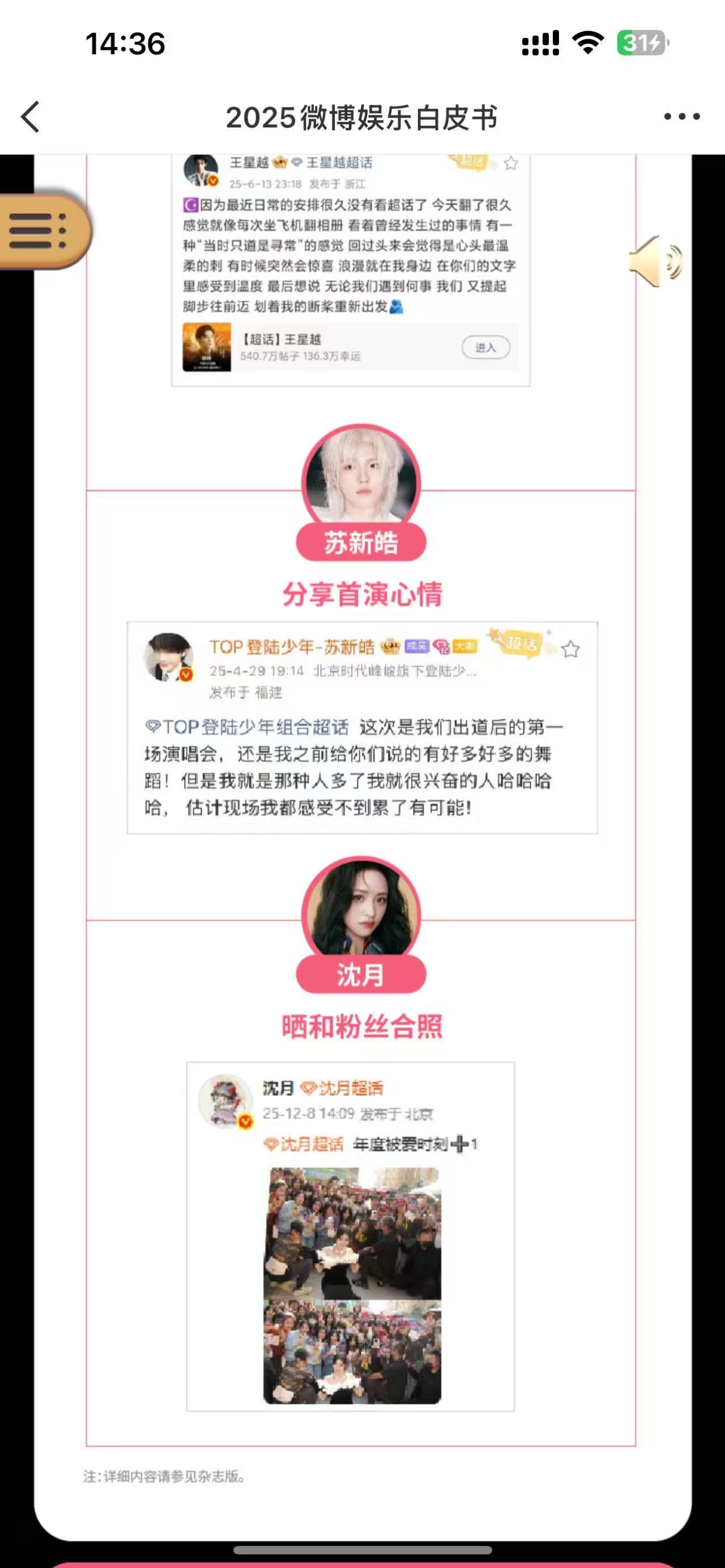 微博娱乐白皮书苏新皓 新生代顶流2025微博娱乐白皮书相关榜单来袭,在“2025年上升过钻3微博超话”榜单中,苏新皓成功占据一席之地,钻3周数达10周。也是05后钻三次数最多的!!!