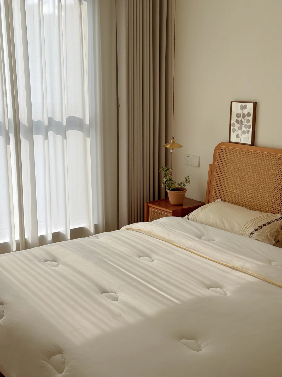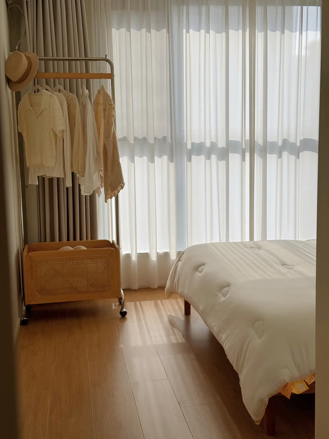 《柔纱裹轻暖》室内柔光轻落衣间,米白纱袖似揉碎的月光,裹着舒展的姿态。领口