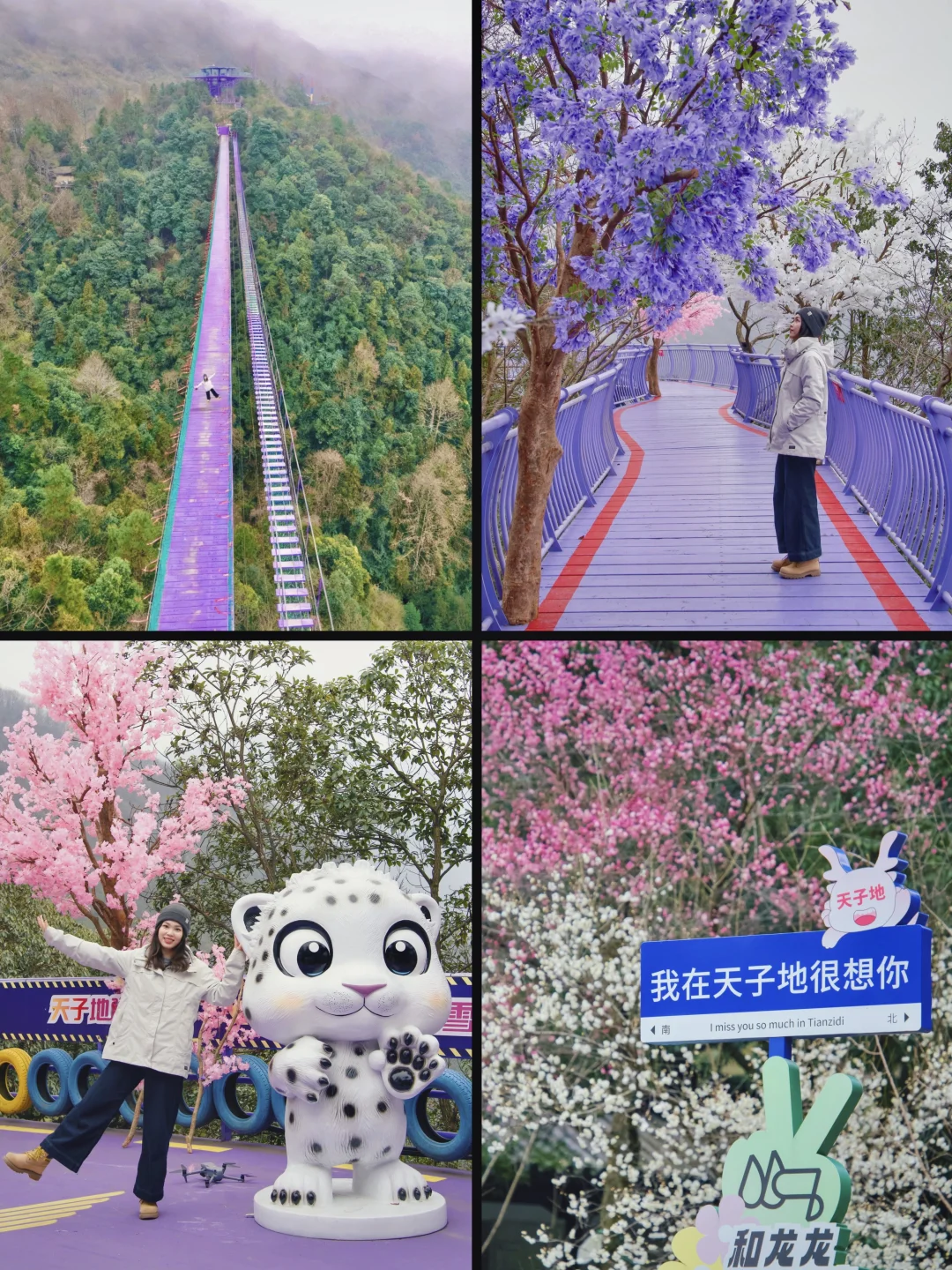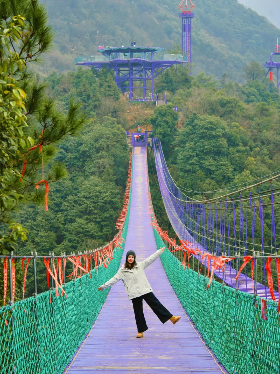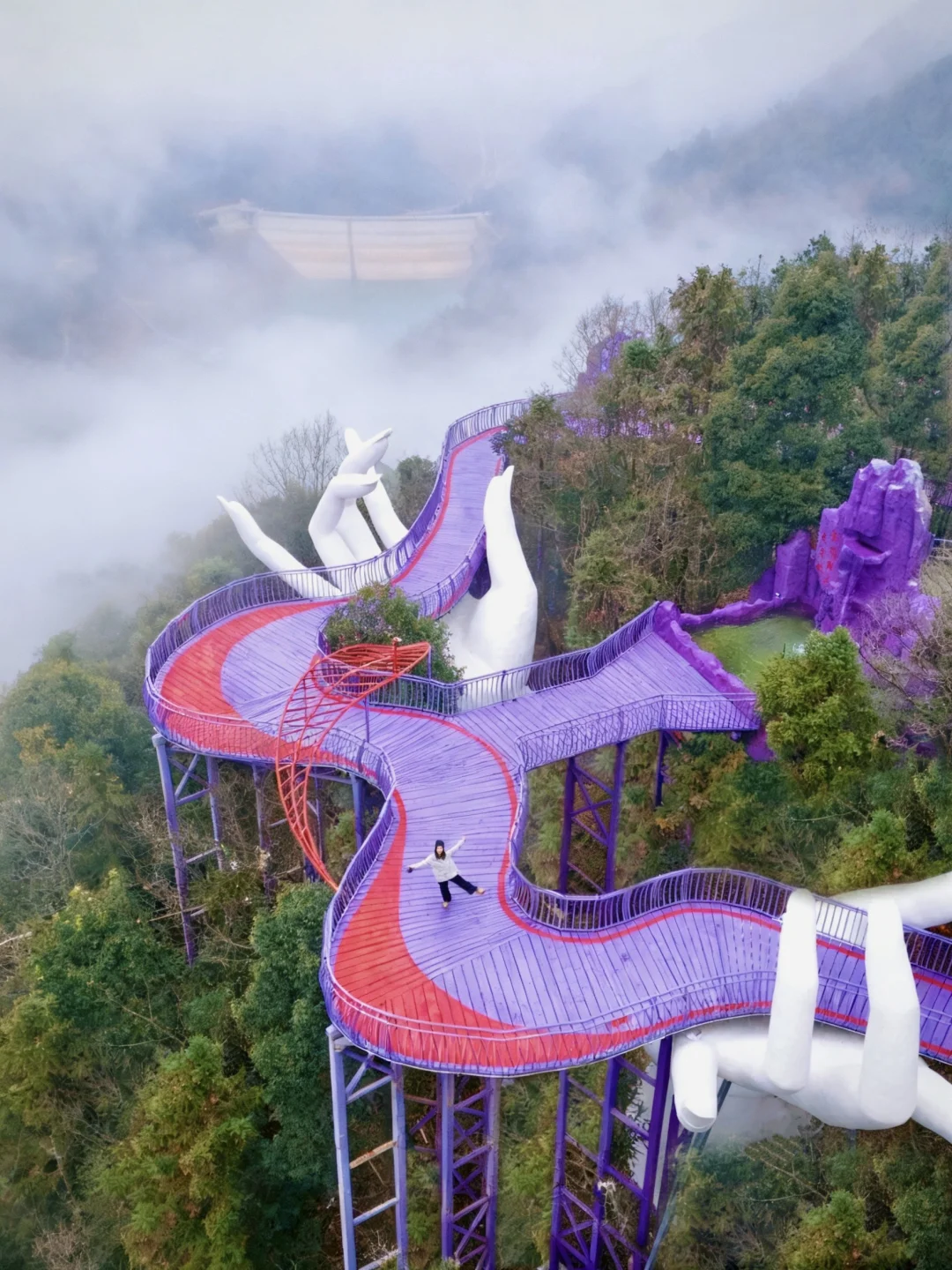 穿行在被玉手托起的“紫色丝带”悬空廊桥,眺望绿水青山湖泊,拍照很出片