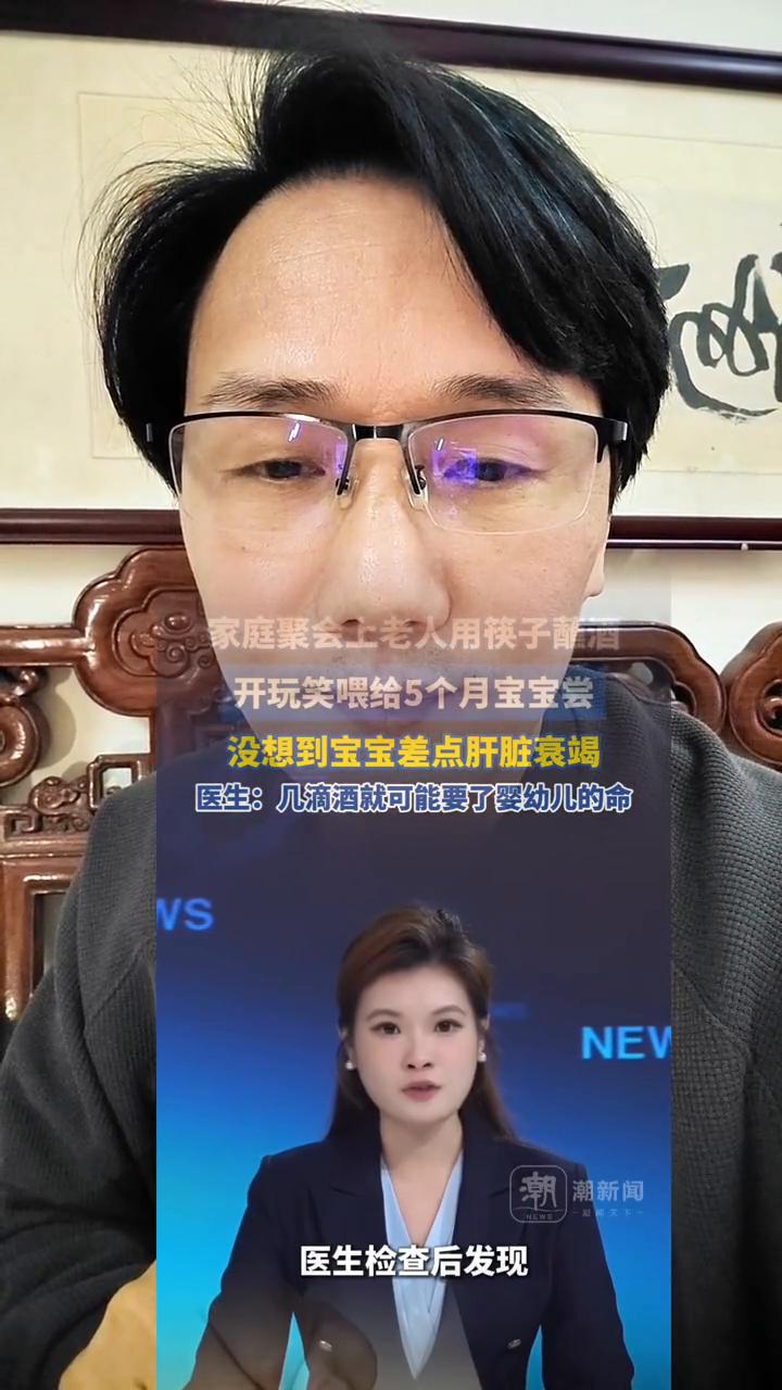 家庭聚会上老人用筷子开玩笑喂给5个月宝宝尝,没想到宝宝差点肝脏衰竭。医生:几滴酒就可能要了婴幼儿的命。 潮新闻实习主持人申佳怡。 这个视频一定要转给家里人看一下,千万不要好心办成了坏事。老人用筷子沾酒给5个月宝宝尝,差点导致宝宝肝衰竭。 据大象新闻2月3日报道,河南郑州一场家庭聚会上,一名老人用筷子沾了点酒给5个月的宝宝尝,没想到这个开玩笑的举动却让宝宝昏睡不止,还出现了皮肤黄疸。医生检查后发现宝宝肝损伤严重,接近肝衰竭。医生提醒:婴幼儿肝脏发育不完全,几滴酒就可能致命,家属切勿给宝宝喂酒。